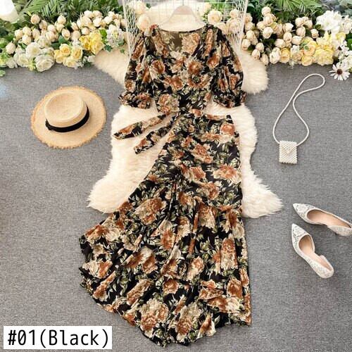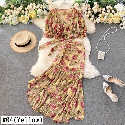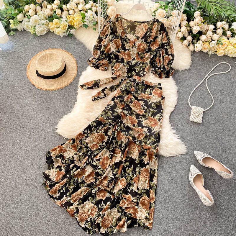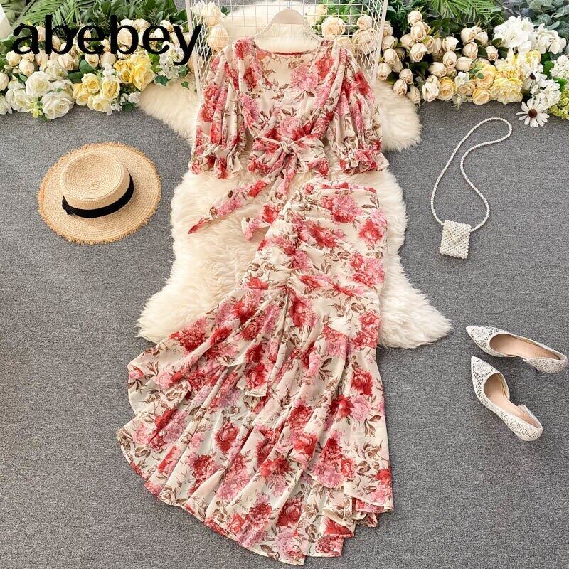 ボヘミアンピンク/ブルー花柄シフォン 2 個セット女性自由奔放に生きるシックな包帯ショートトップス + ウエストマーメイドスカートセット 2022 Abe42216780934