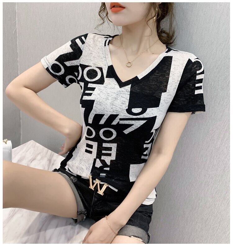 夏の Tシャツ女性 V ネックスリムトップスベーシック Tシャツ長袖セクシーなストレッチプリント Tシャツ潮 ロング サマー 夏物 Vネック Rhc175378684