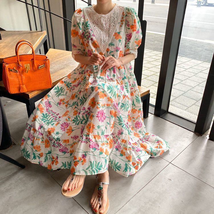2021 夏の女性ルーズウエストスリムだった薄いレース中空スプライスパフスリーブマキシドレス サマー 夏物 Rhc3789864974
