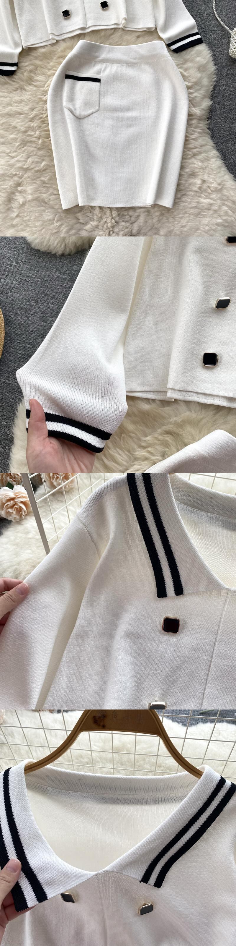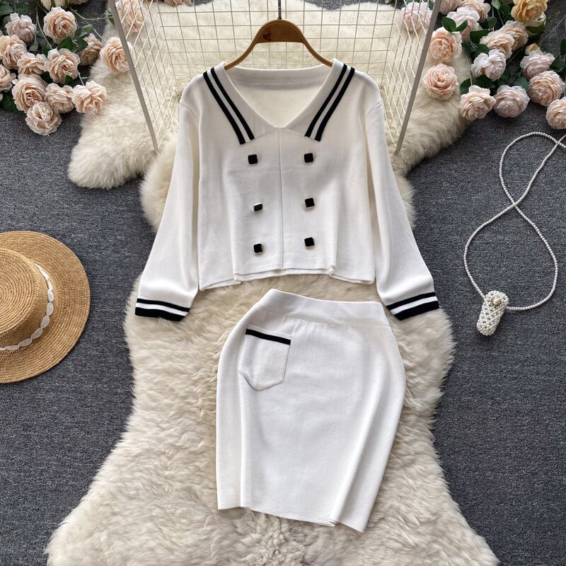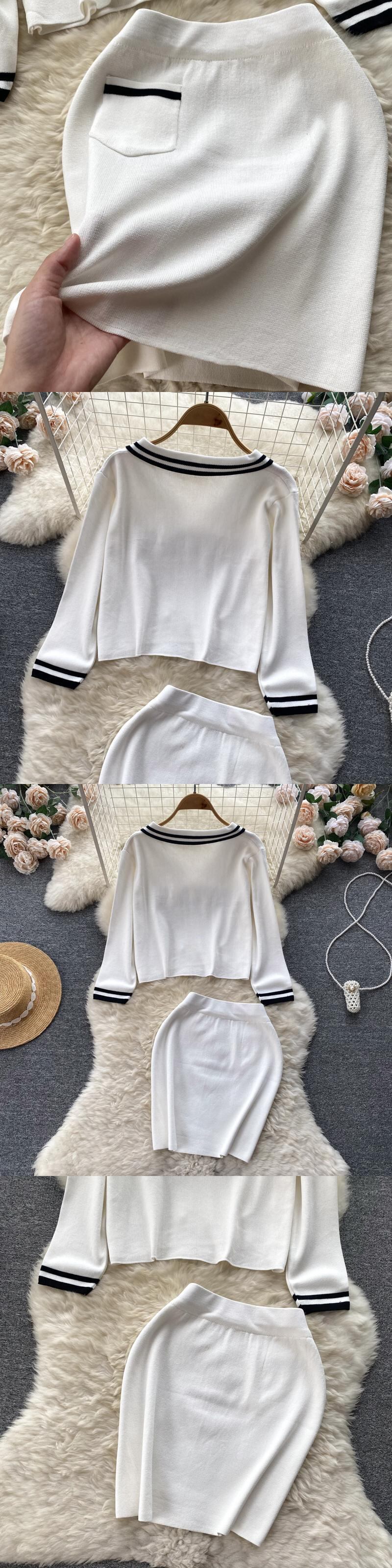ホワイトニットプルオーバートップとショートスカート 2 点セット女性スリムフィットセーター女性秋のセーターの衣装の女性 オータム 秋物 Abe65336190622