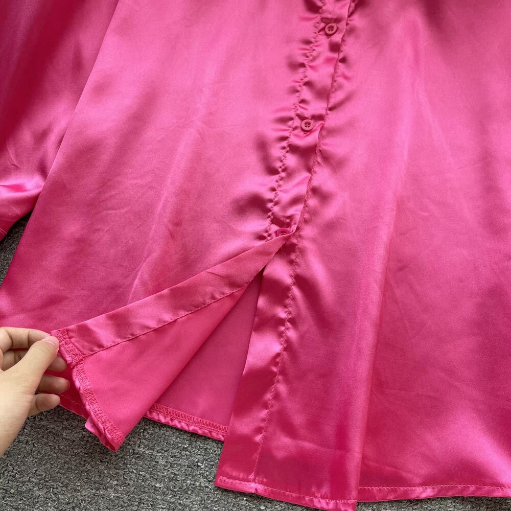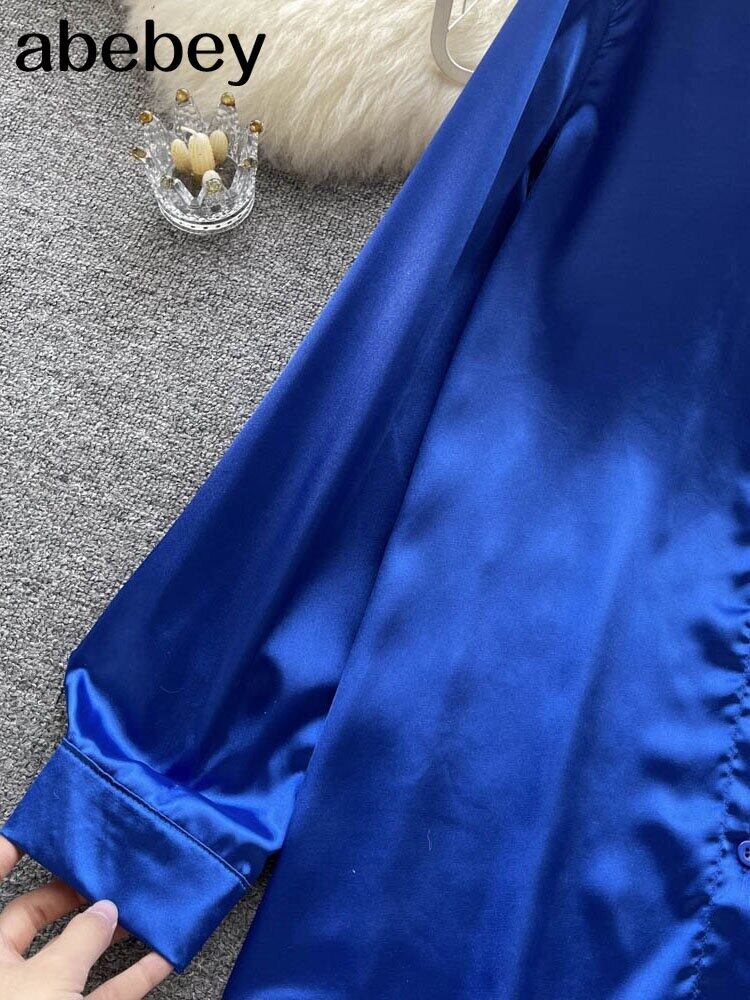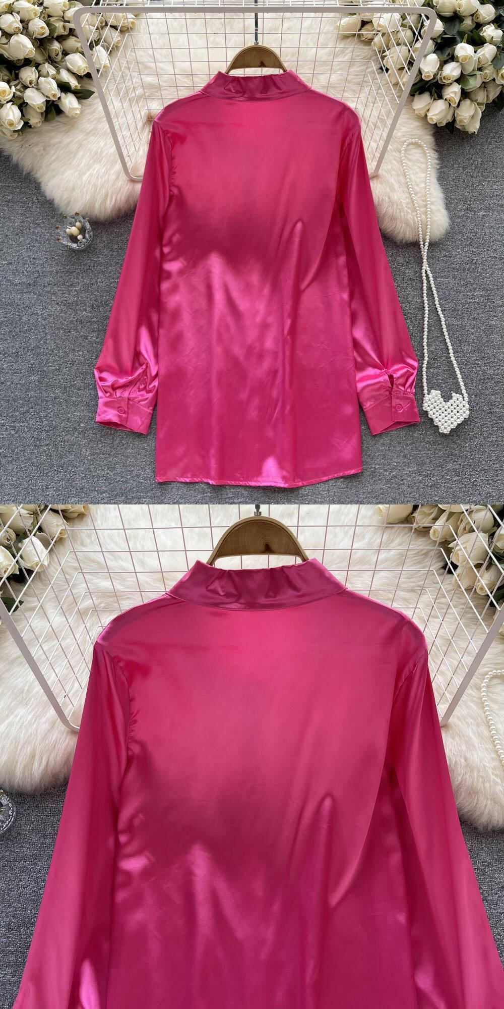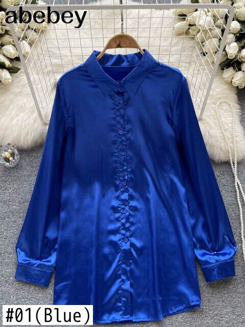 レディースサテンオフィスシャツ無地長袖シルキーブラウスボタン春夏 2022 ルーズトップスラペル ロング スプリング 春物 サマー 夏物 ソリッドカラー 会社 学校 通勤や通学にも Abe3192651407