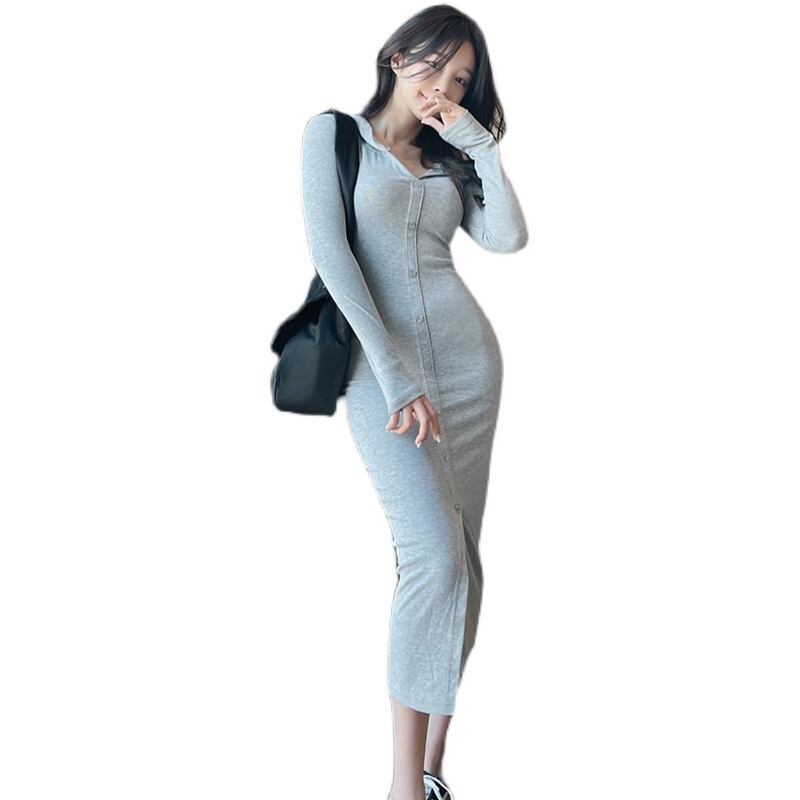 2021 秋冬女性フード付きネックロングスリーブシングルブレストペンシルドレスプルオーバースリムウエストニットドレス 長袖 ウィンター 冬物 Rhc62982648763