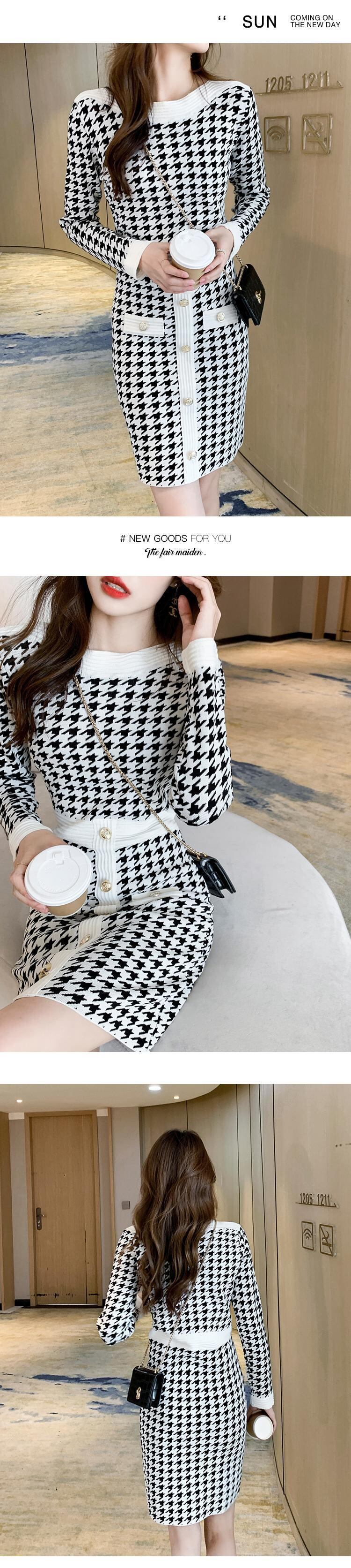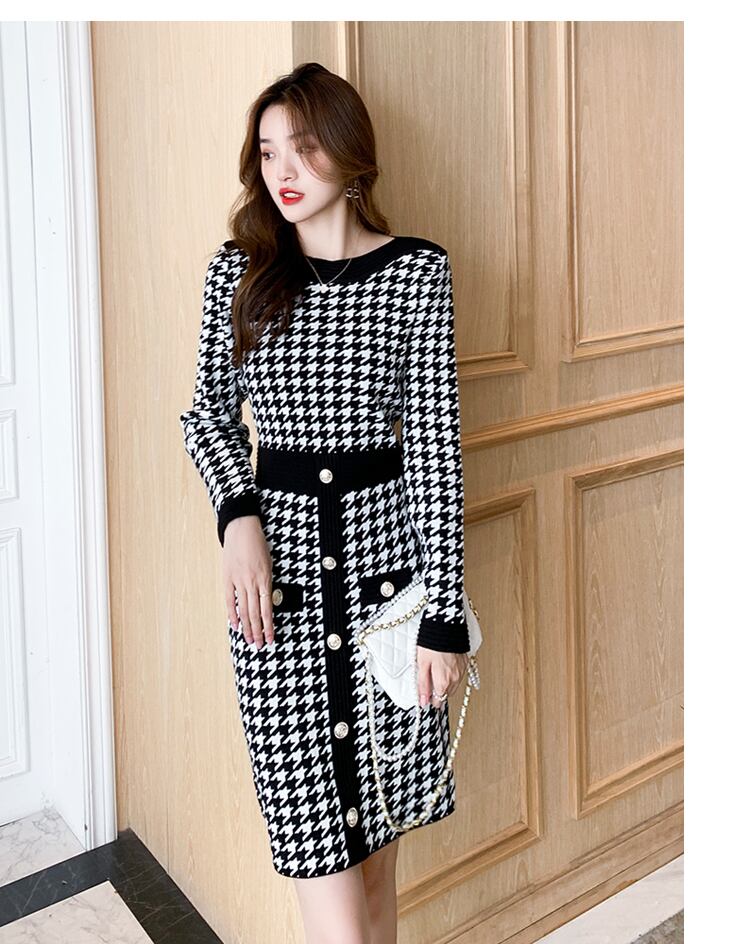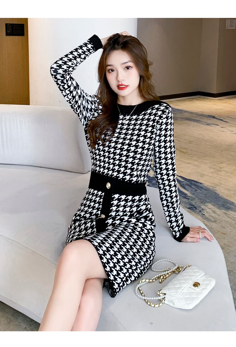 女性のセクシーなオフショルダー千鳥格子ニットドレス 2022 秋の気質セーターローブ オータム 秋物 Abe42026316346