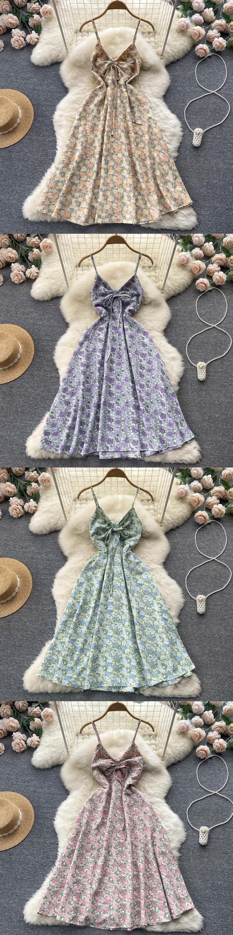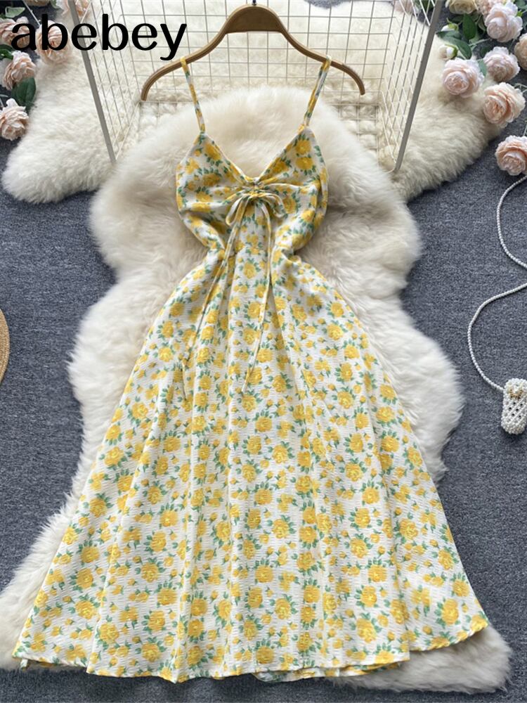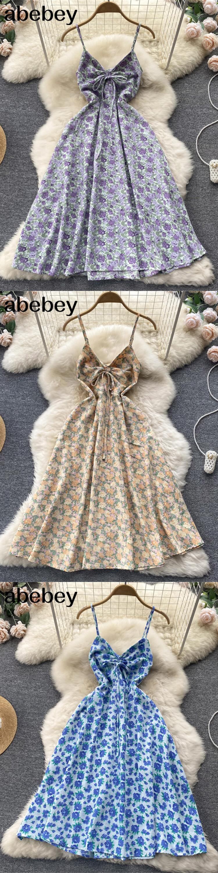 夏花柄プリーツドレス女性のセクシーな V ネック背中の開いたミディビーチサンドレスピンクストラップ A ラインドレス 2022 サマー 夏物 Vネック Aライン Abe14125142160