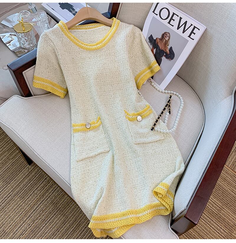 フレンチニット女性ドレスボディコン半袖イエロー 2022 ポケット夏休みセクシーなパーティーミニドレス女性 ショート ハーフスリーブ サマー 夏物 Rhc58160586066