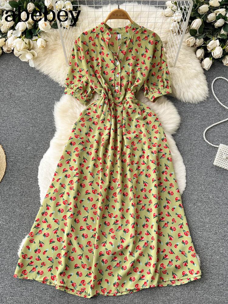 夏のプリント花柄ドレス女性 V ネック ボヘミアン ドレス ビーチ ボタン ラップ マキシ ロング ドレス 2022 サマー 夏物 Vネック Abe2407724911