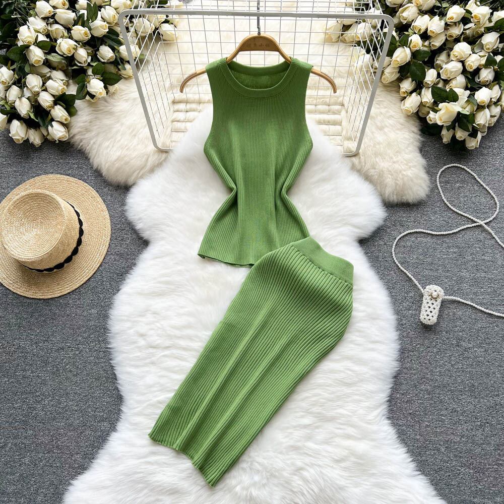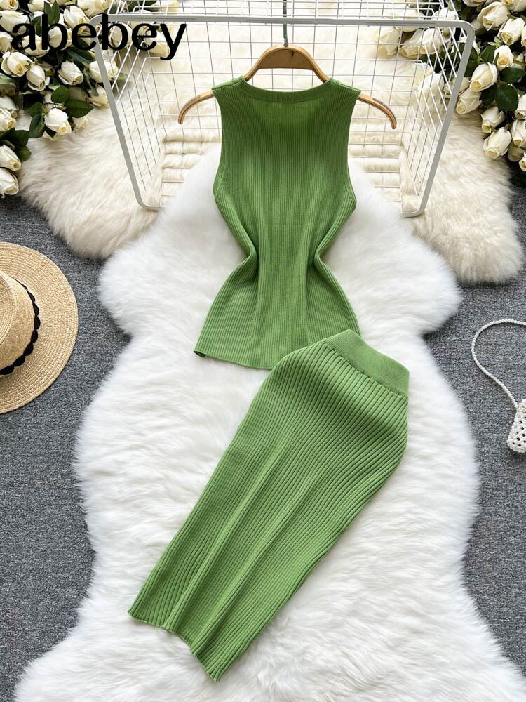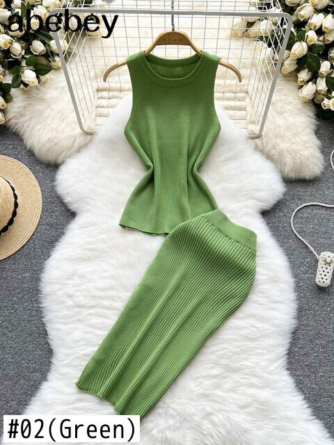 女性の夏のニットツーピースセット O ネックセクシーなタンクトップ + 弾性ウエストロングスカート固体女性スーツ エラスティック 伸縮 サマー 夏物 Oネック ソリッドカラー Abe37051760673
