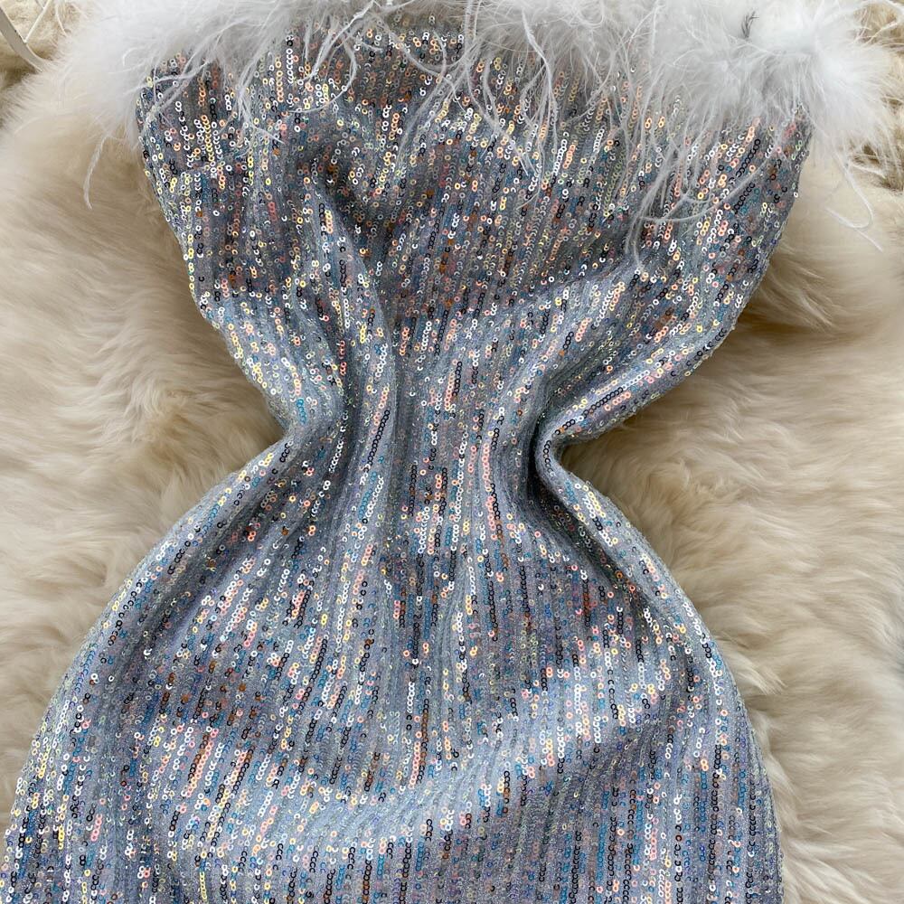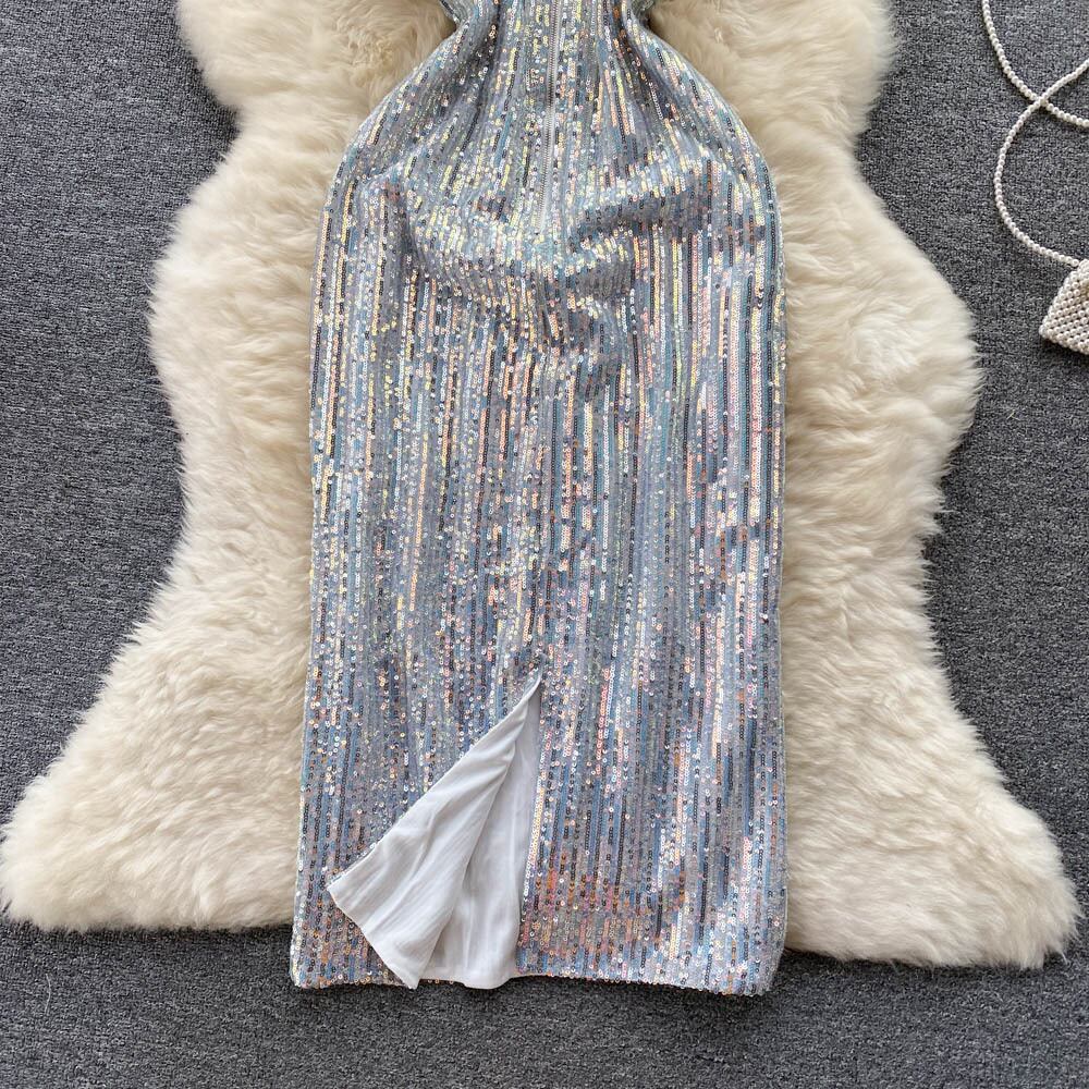 秋シルバースパンコール背中の開いたセクシーなドレス女性オフショルダーミニドレスクリスマスパーティークラブストラップドレス Vestidos オータム 秋物 銀 Abe43890419726