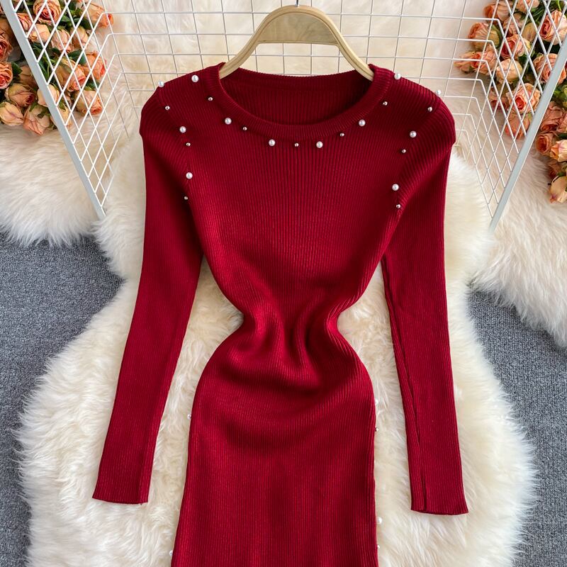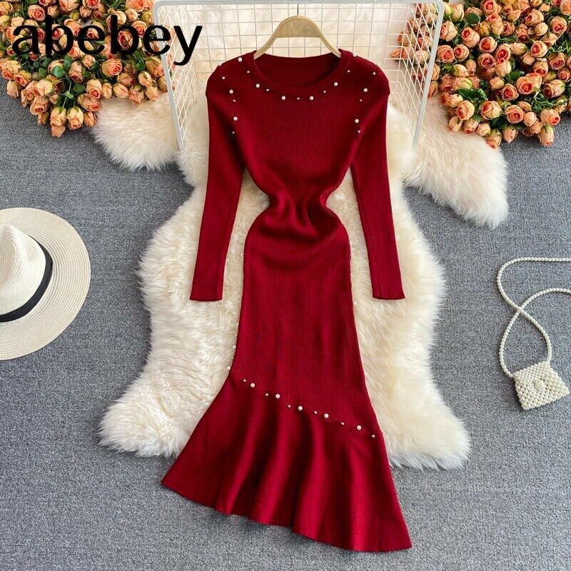 女性ニットマーメイドドレスビーズ長袖スリムフリルドレス秋冬暖かいセータードレス ロング ラッフル オータム 秋物 ウィンター 冬物 Abe5605676647