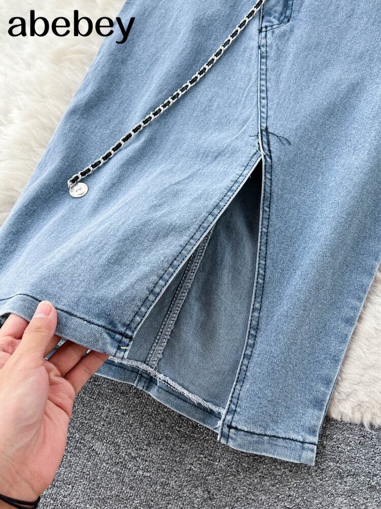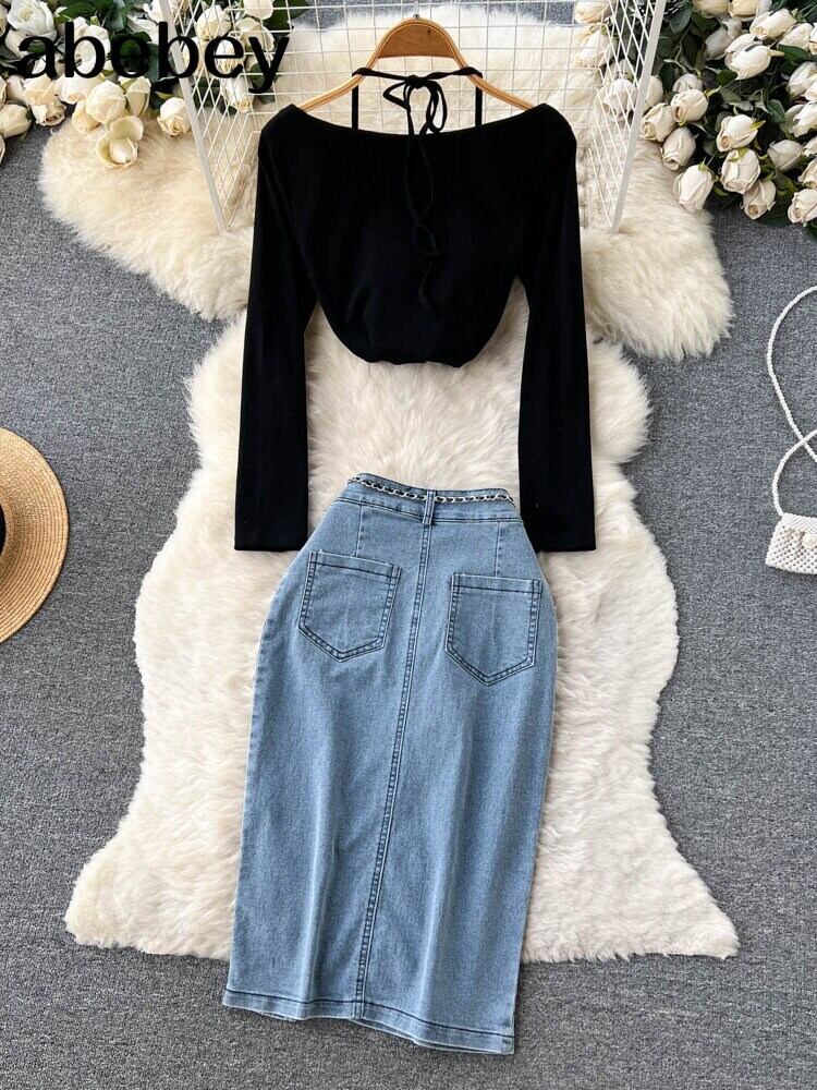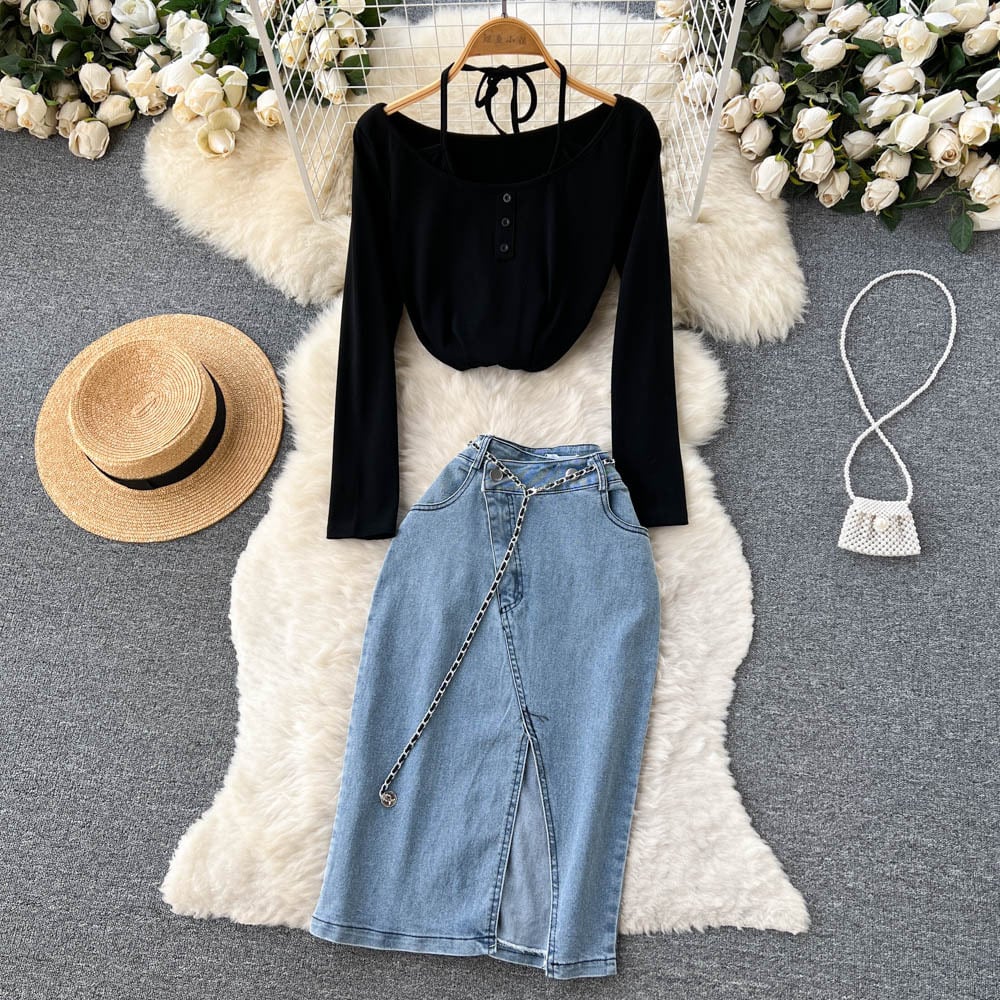 夏の女性 2 2 個セットセクシーなスラッシュネッククロップトップ + ウエストボタンアップデニムスカートオフィスレディノースリーブスーツ サマー 夏物 会社 学校 通勤や通学にも Abe42228753963