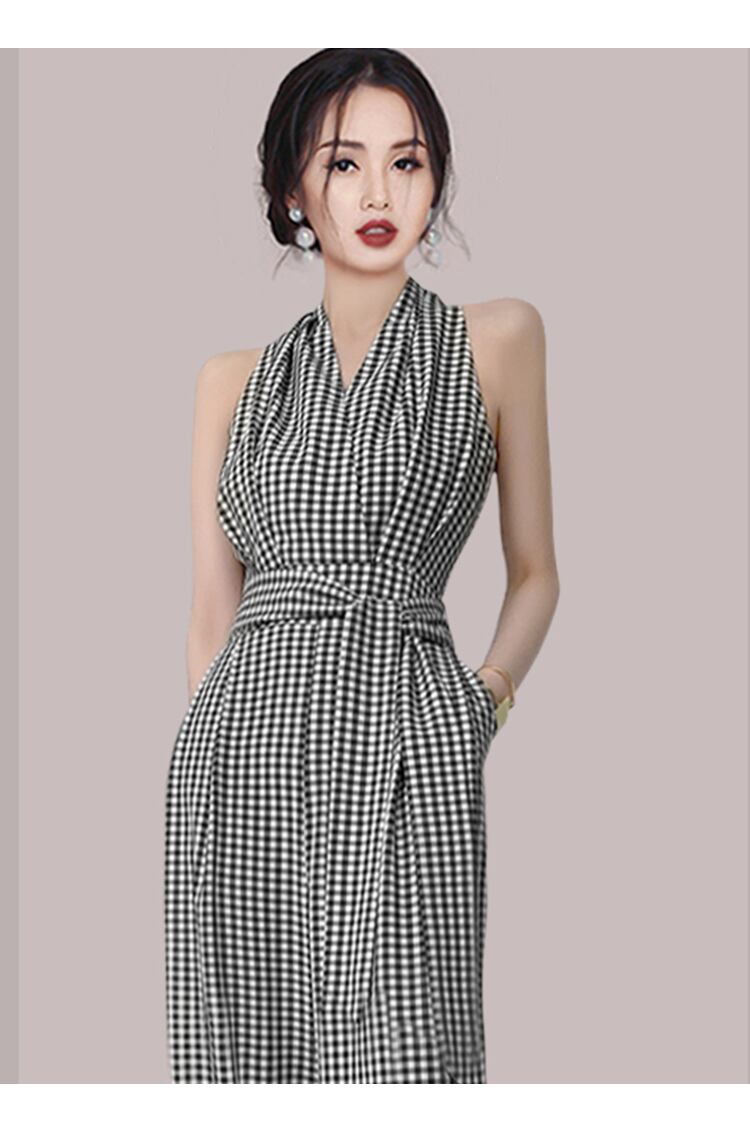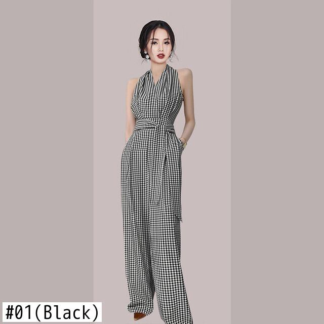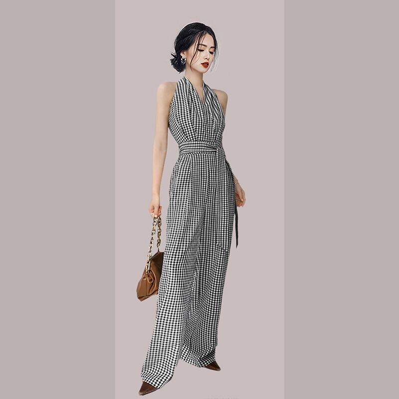 ジャンプスーツ女性 2022 セクシーなワイドレッグパンツノースリーブジャンプスーツ格子縞のオーバーオールロンパース ワイドパンツ Rhc56424648549