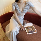 2022 ドレスウエストレディーシックなセクシーなレースの花びらスリーブの女性の夏のロングイブニングドレス サマー 夏物 Rhc11874052650