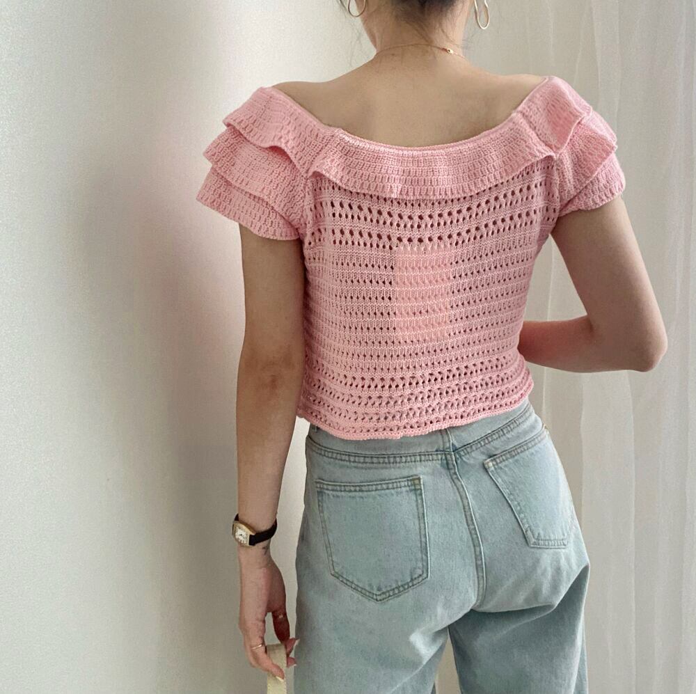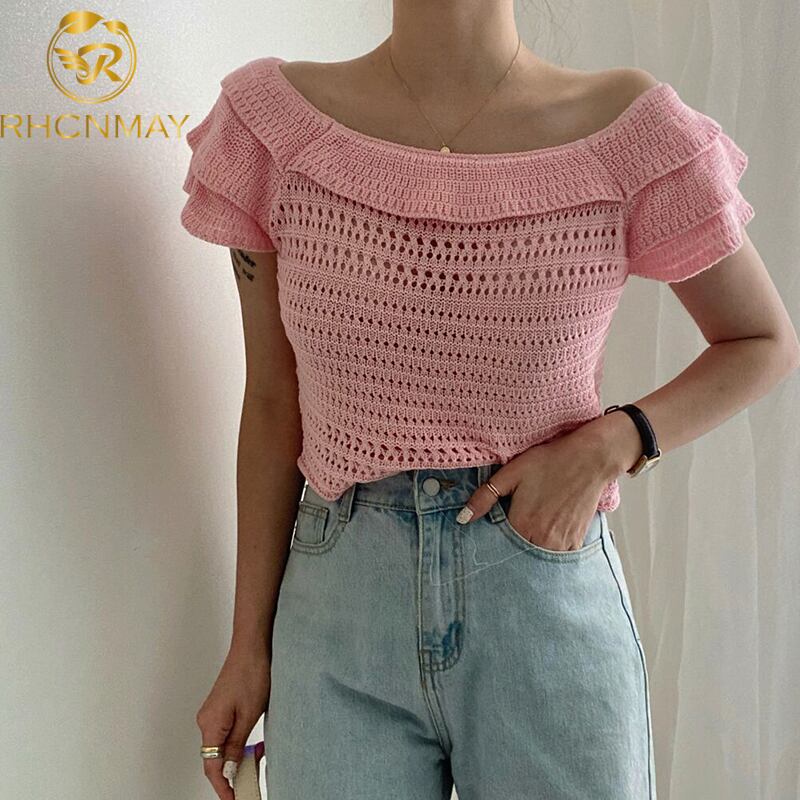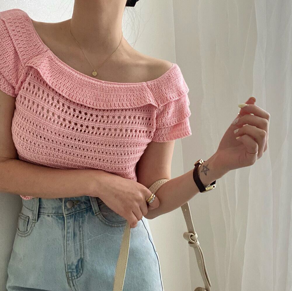 夏フライングスリーブオフショルダー薄型中空アウトニットセーター女性プルオーバー 2022 シックなニット女性クロップトップ サマー 夏物 Rhc33050402106