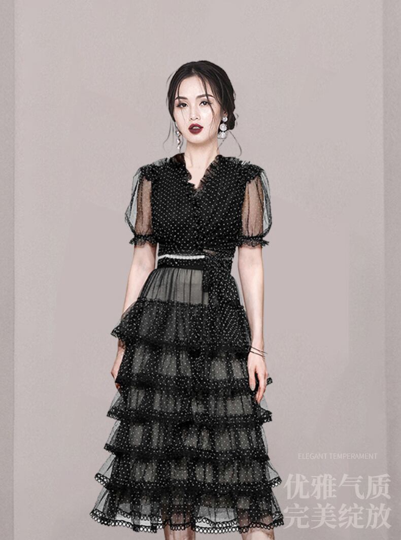 夏メッシュツーピースセット女性 V ネックポルカドットレースアップ黒トップス + レイヤーフリルケーキロングスカートスーツ ブラック ラッフル サマー 夏物 Vネック Rhc65092024385
