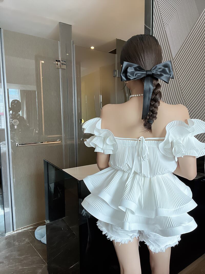 2022 夏甘いプリーツ シフォン シャツ女性のシンプルなオフショルダー ストラップ ウエスト フリル トップ 大人ガーリー スウィート キュート カジュアル サマー 夏物 Rhc10095296752