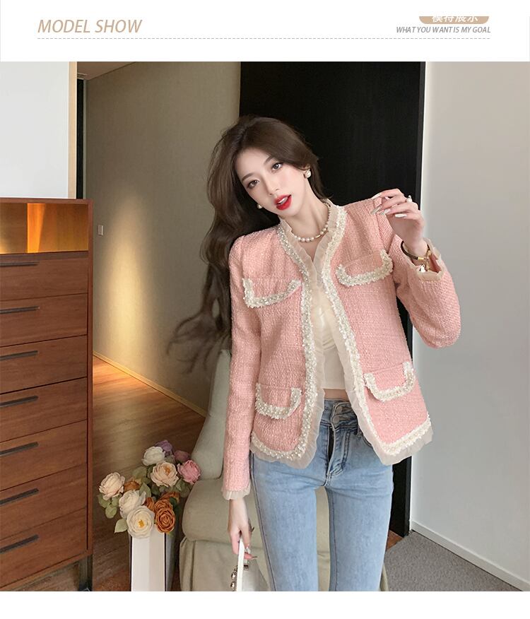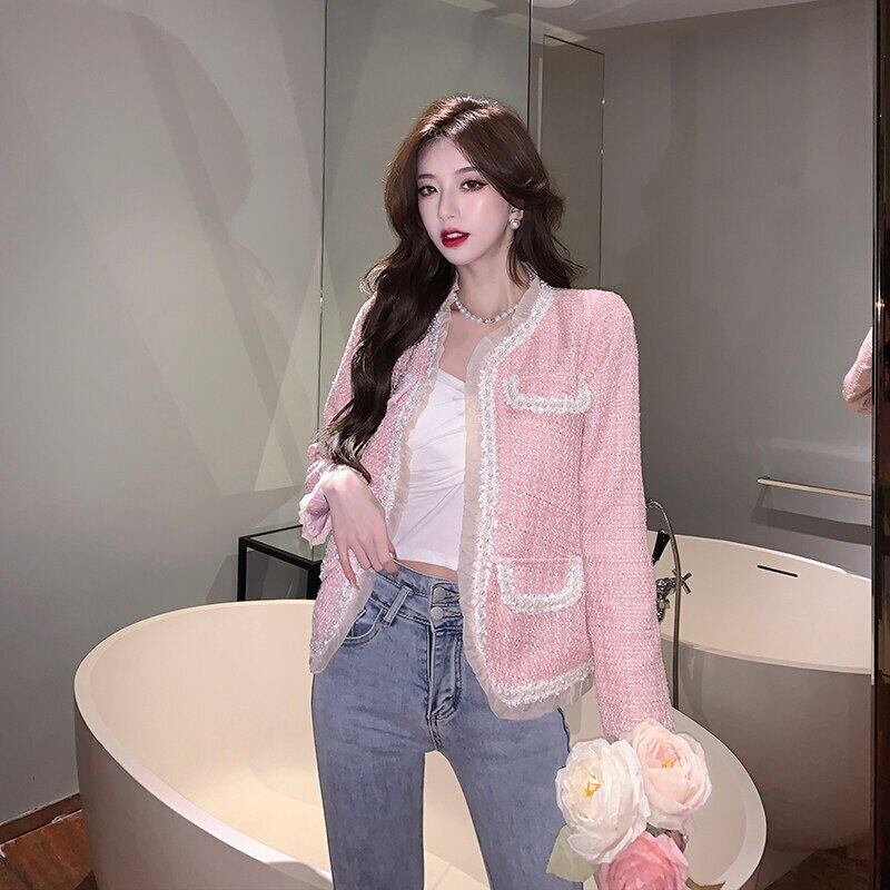 女性のジャケット秋 2022 ツイードコート女性 O ネック長袖ピンク織ジャケット生き抜く ロング オータム 秋物 Oネック Rhc51996232652