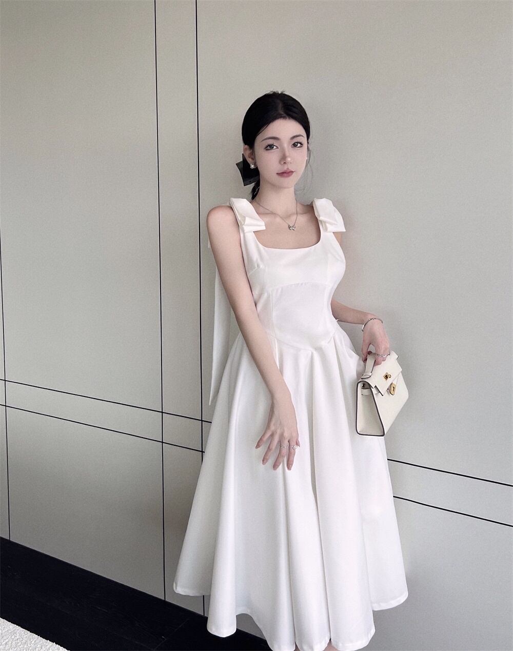 女性ホワイトセクシーなボールガウンミディ丈ドレススクエアネックノースリーブルーズフィットボウタイドサマーブラックレスドレス リボン 夏物 スクウェア Rhc61165073353