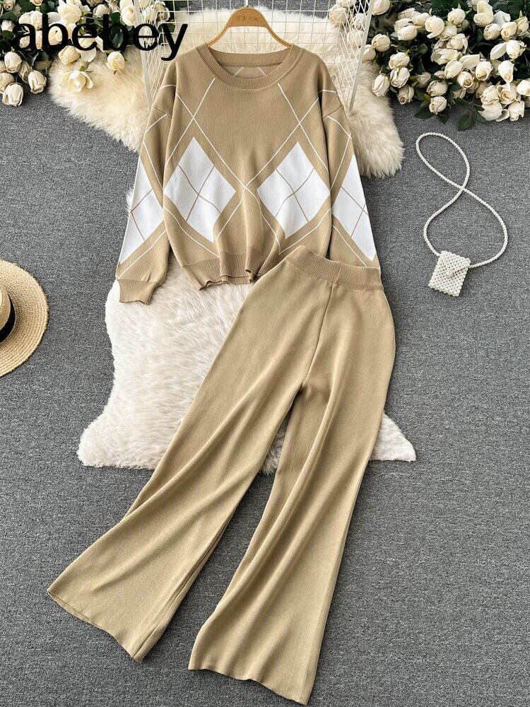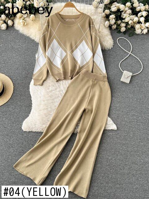 スポーツ冬のセーター セット アーガイル チェック柄ニット トップ + 弾性ワシット ワイドレッグ パンツ ニット ツーピース スーツ エラスティック 伸縮 ウィンター 冬物 ワイドパンツ Abe12550147687