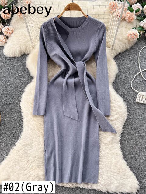 女性ニットドレス長袖 O ネック弾性暖かいロングドレス女性秋ボディコンボウセータードレス リボン エラスティック 伸縮 オータム 秋物 Oネック Abe10158672763