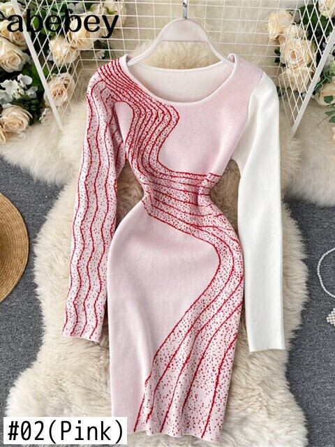 ストライプ Vinage プリントジオメトリニットドレス女性長袖弾性ウエスト暖かいドレスパーティーセーターミニドレス ロング エラスティック 伸縮 Abe3412592668