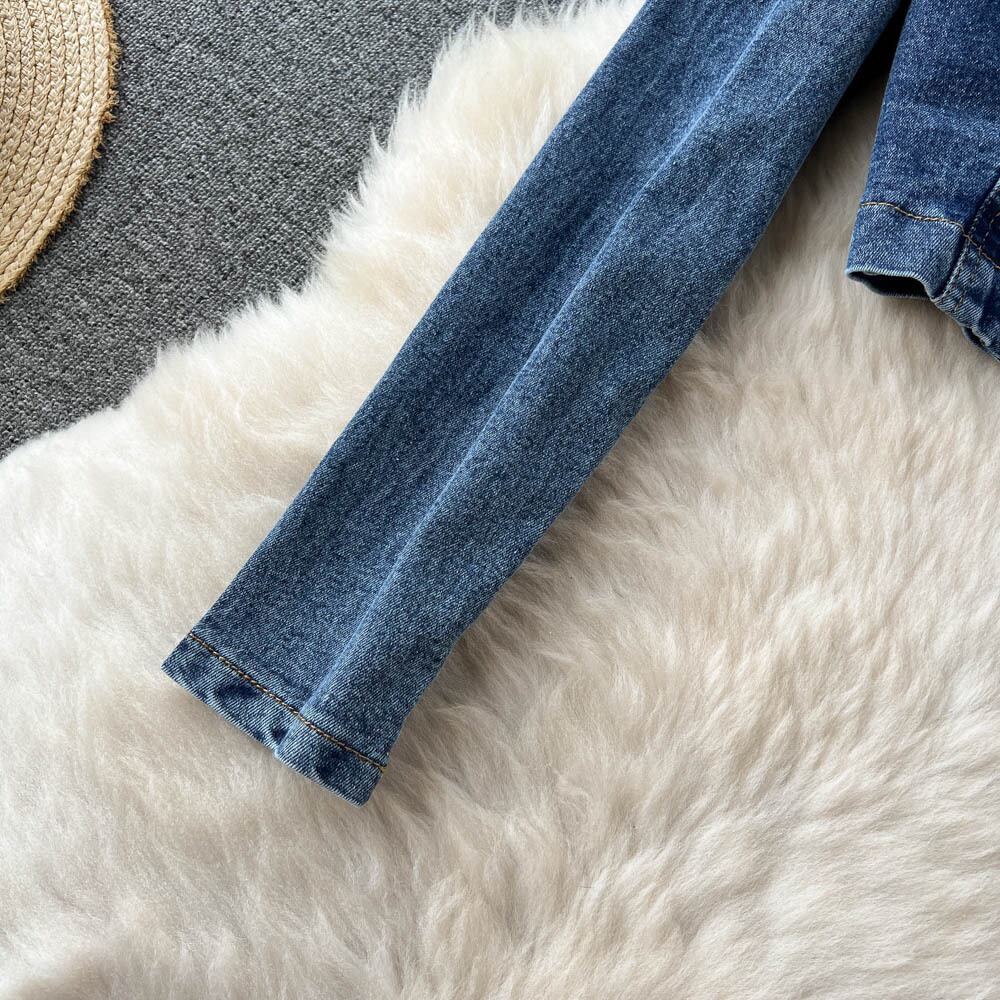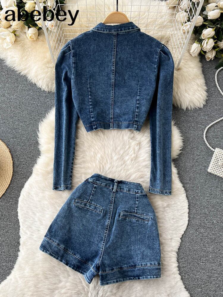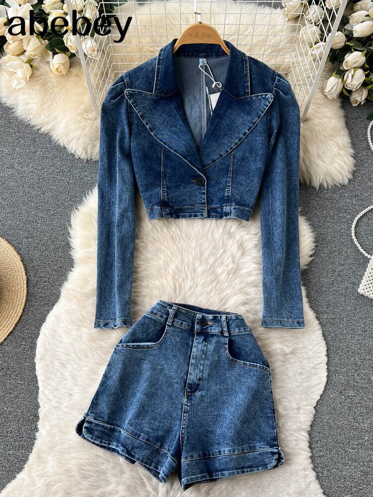 ヨーロッパスタイルのデニムスーツの衣装の女性の無地デニムジャケットショートジャケット & ジーンズパンツショーツ 2 点セット ブルマー ソリッドカラー ヨーロピアン Abe48145178878