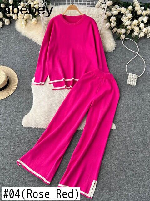 緩い冬のセータースーツ女性 O ネックニットトップ + ワイドレッグニットロングパンツオフィスレディウォーム二枚セット ウィンター 冬物 Oネック ワイドパンツ 会社 学校 通勤や通学にも Abe30564048519