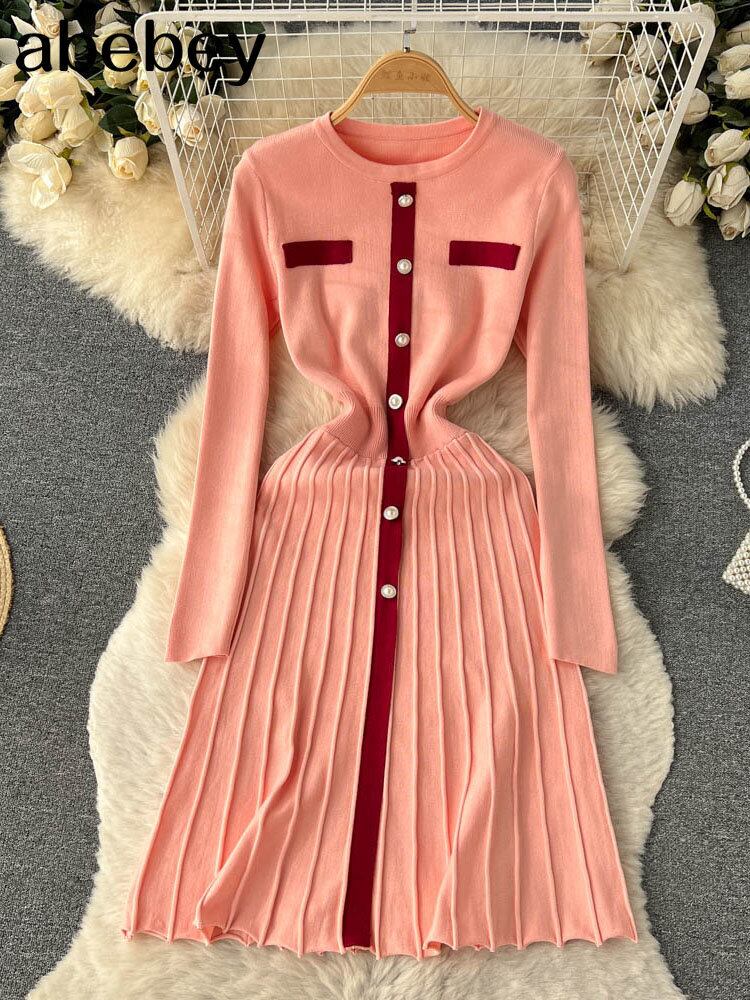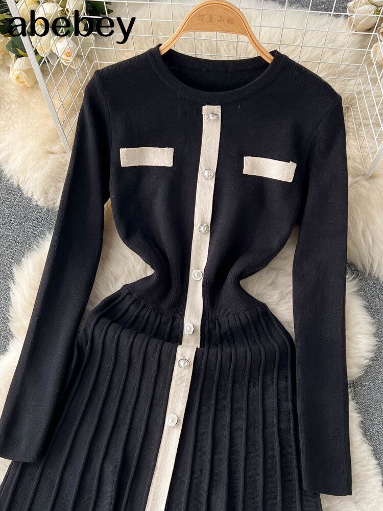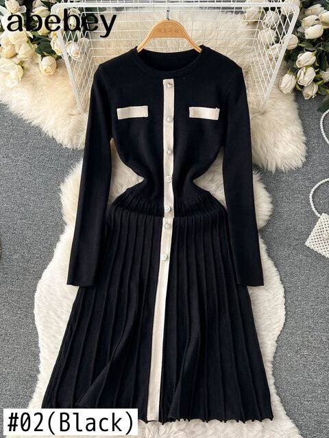 2022 秋ニット女性ロングプリーツドレス女性長袖シングルブレスト A ラインドレス Vestidos オータム 秋物 Aライン Abe91158576364