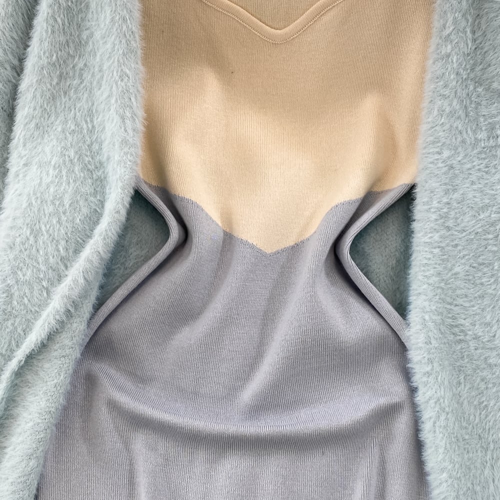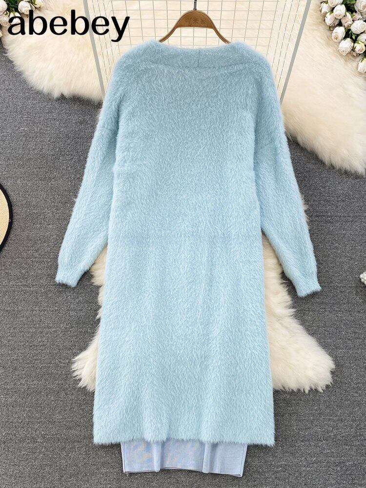 ブルー 2022 ニット女性セットルーズロングスリーブカーディガンセーター + ソリッド弾性ドレスフレンチスタイルツーピースセット衣装 長袖 エラスティック 伸縮 ソリッドカラー Abe10752369269