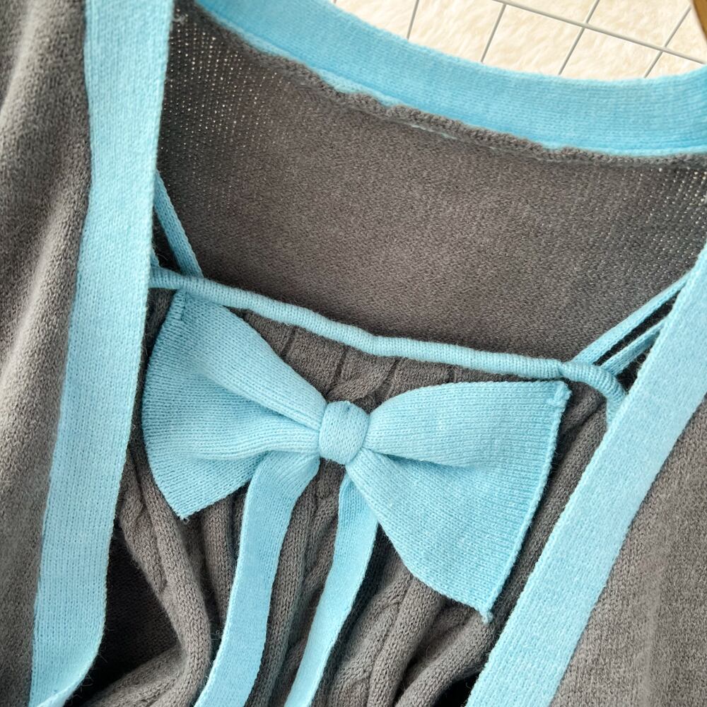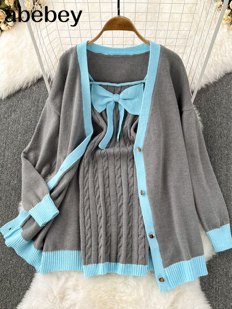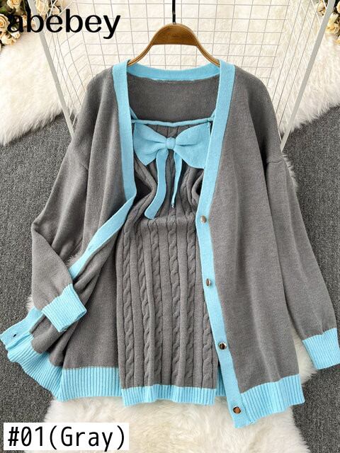 コントラストカラーニット女性セットルーズロングスリーブカーディガンセーター + 弾性ドレスフレンチスタイルツーピースセット衣装 長袖 エラスティック 伸縮 Abe32623265910