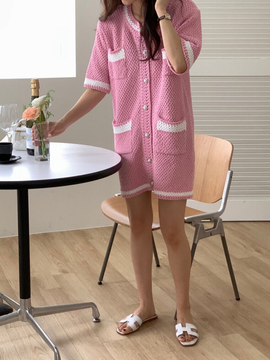 女性ショート ストレート ニット ドレス夏ラウンド ネック カラーブロック マルチ ポケット パール シングル ブレスト半袖ニット ジャケット ハーフスリーブ サマー 夏物 Oネック 真珠 ポケット多め マルチポケット Rhc24380526143