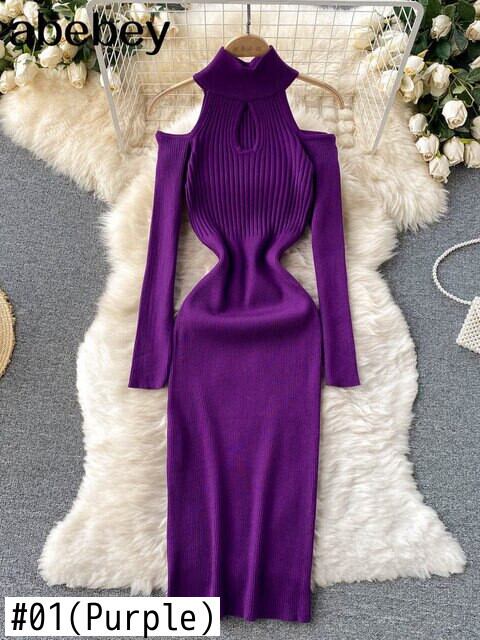 オフショルダー女性ニットペンシルドレス長袖弾性スリムドレス秋冬セクシーなボディコン暖かいセーターマキシロングドレス エラスティック 伸縮 オータム 秋物 ウィンター 冬物 Abe5456221897