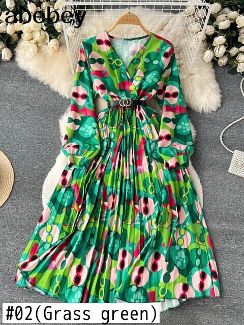 Vネック半袖ロングドレスサマープリーツスリムウエストAラインドレス女性花柄プリントオフィスドレス ショート ハーフスリーブ 夏物 会社 学校 通勤や通学にも Abe42323166622