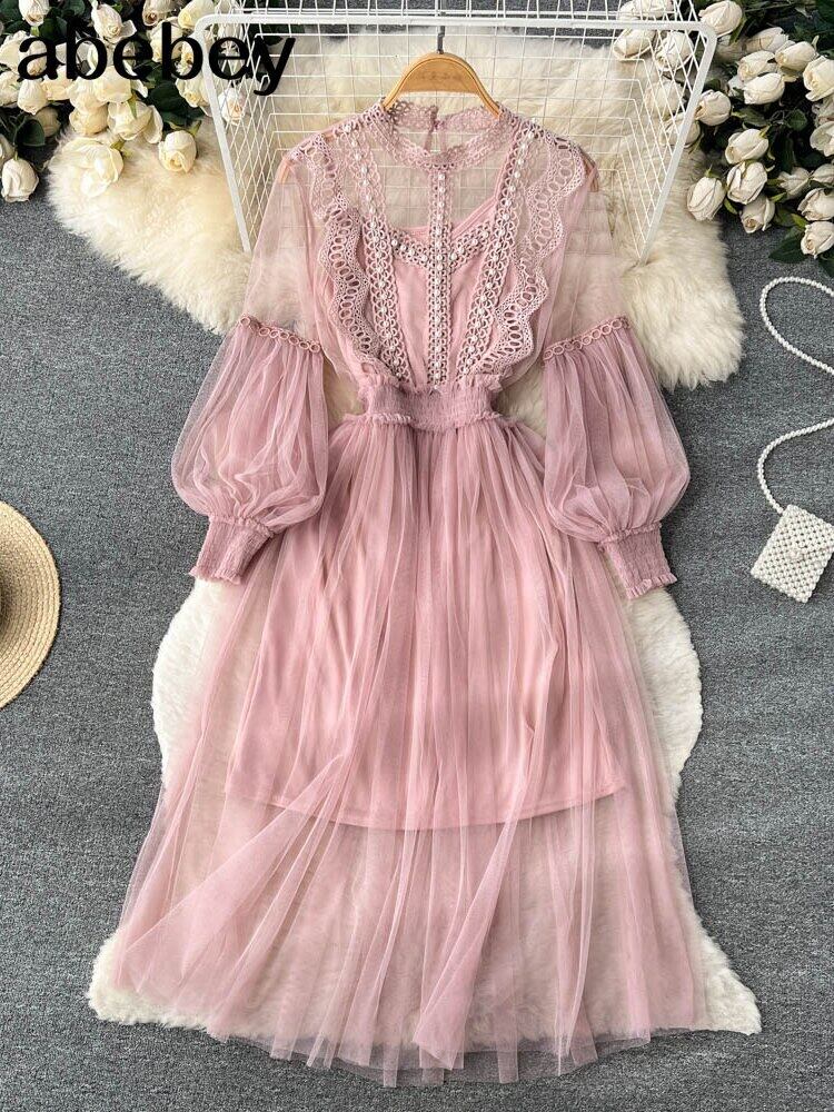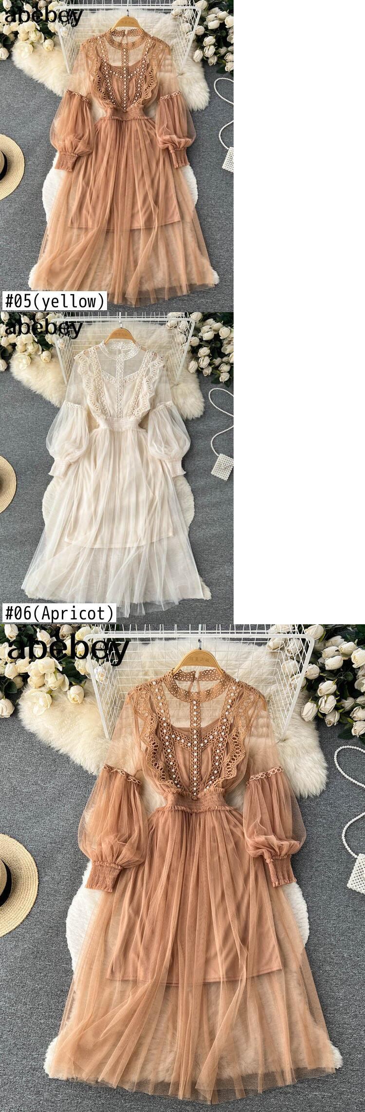 フレンチメッシュドレス 立体フラワーロングスリーブAラインドレス+ノースリーブストラップドレス ツーピーススーツ 長袖 フラワーデザイン Abe66774970651