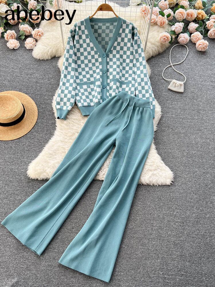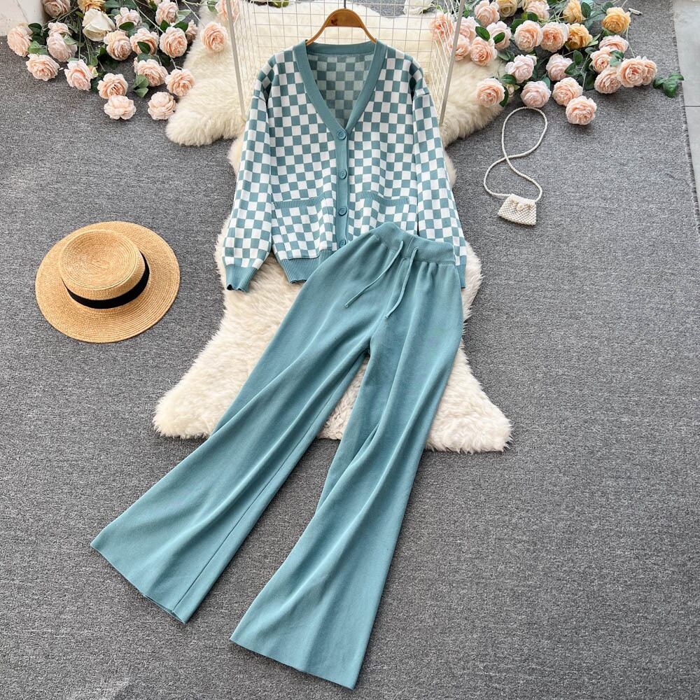チェック柄ニットツーピーススーツ女性ルースニットカーディガン + ワイドレッグニットロングパンツ 2022 冬 OL セーターセット ウィンター 冬物 ワイドパンツ Abe59083740809