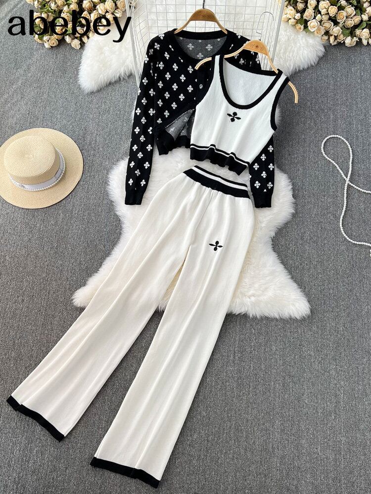 女性トラックスーツシックな 3 点セット ニット白ラウンジ スーツ黒カーディガン セーター + ジョガー パンツ + ノースリーブ タンク トップ ホワイト ブラック Abe9518281670