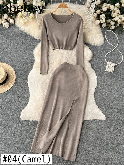 2022 ニット冬の女性のセクシーなセータースカートスーツ Y2K 長袖クロップトップスとロングスプリットスカートドレス 2 点セット ウィンター 冬物 Abe74674486886
