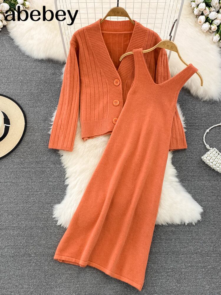 グリーン 2022 ニット女性セットルーズ長袖カーディガンセーター + ソリッド弾性ドレスフレンチスタイルツーピースセット衣装 ロング エラスティック 伸縮 ソリッドカラー Abe69565163915
