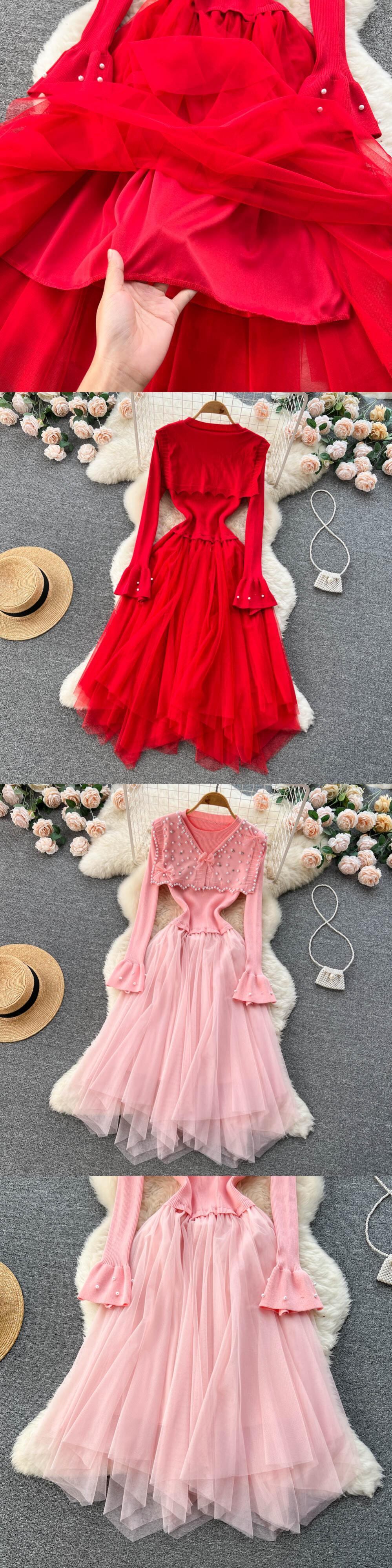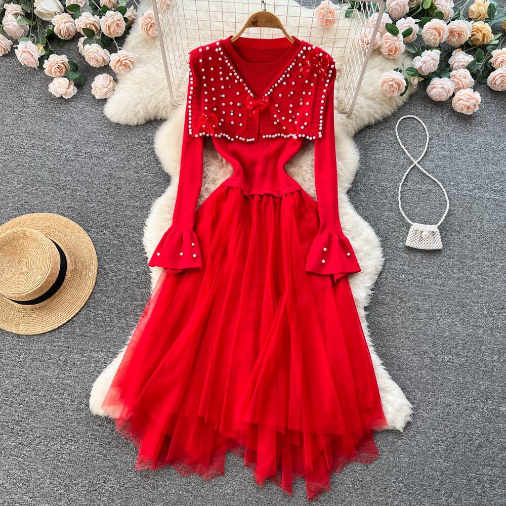 女性ニットロングドレス秋冬 2022 メッシュ A ラインミディドレスビーズリブレッドローブ オータム 秋物 ウィンター 冬物 Aライン Abe72957945247