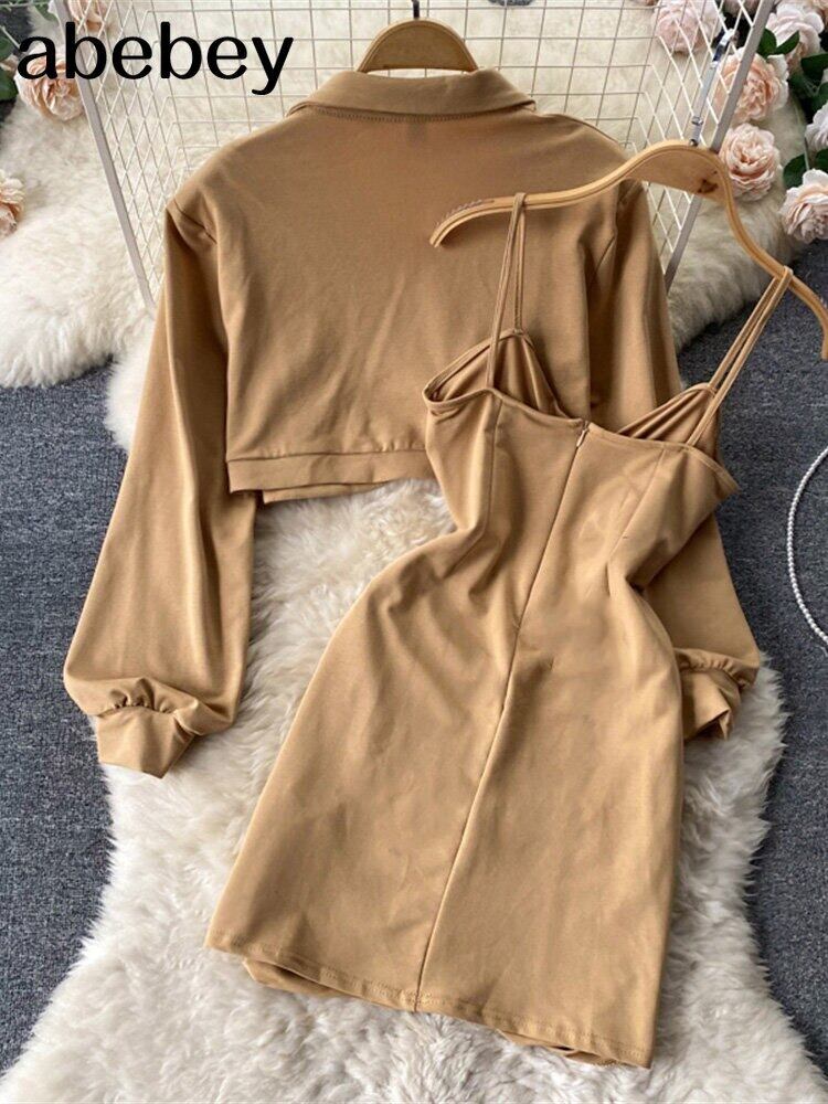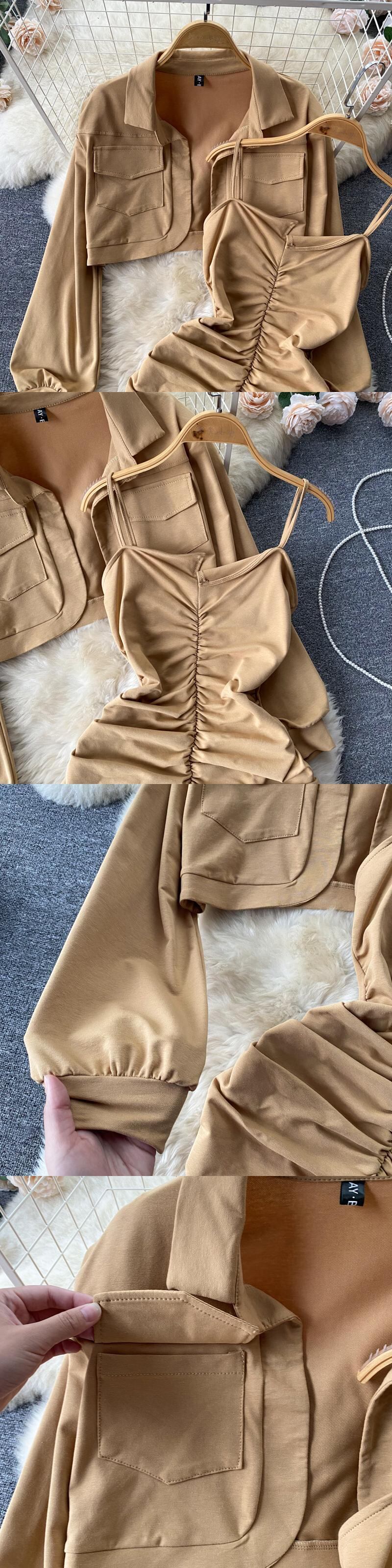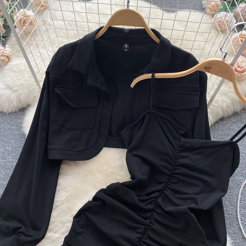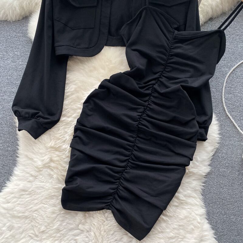 女性 2 点セット ランタン スリーブ ブラウス クロップ トップ + ボディコン スリム ウエストシャーリング スパゲッティ ストラップ ドレス ランタンスリーブ Abe4715314373