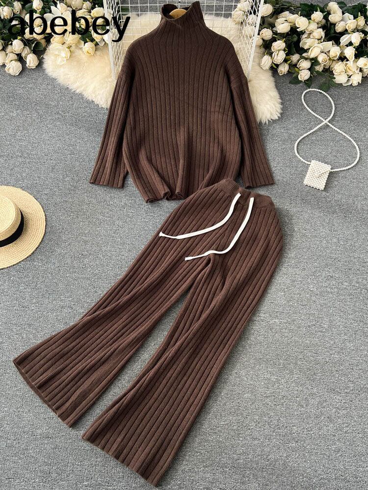 タートルネック長袖プルオーバートップ + ワイドレッグパンツスーツ衣装秋の女性の冬の 2 点セット ロング オータム 秋物 ウィンター 冬物 ワイドパンツ Abe83893930022