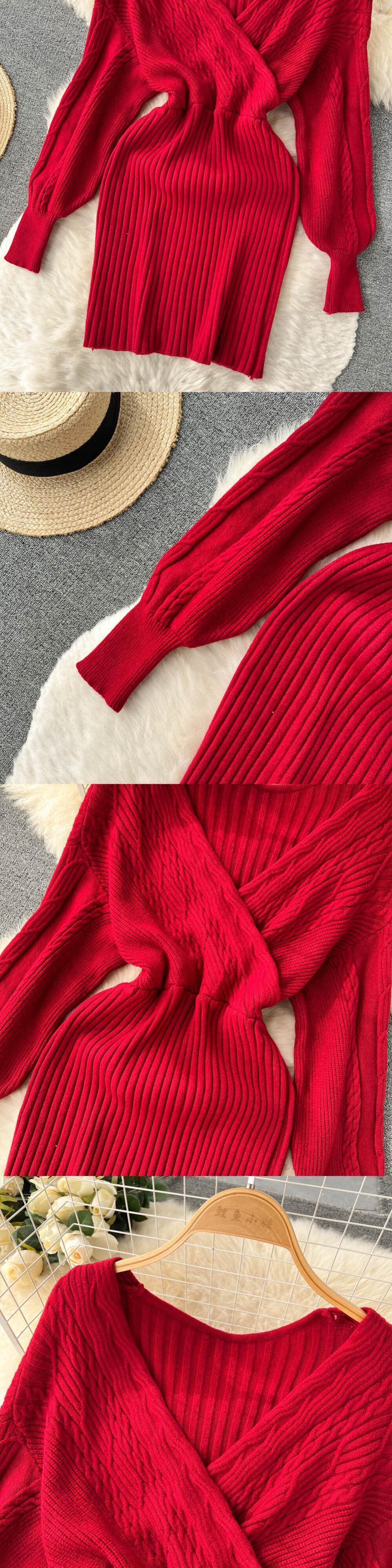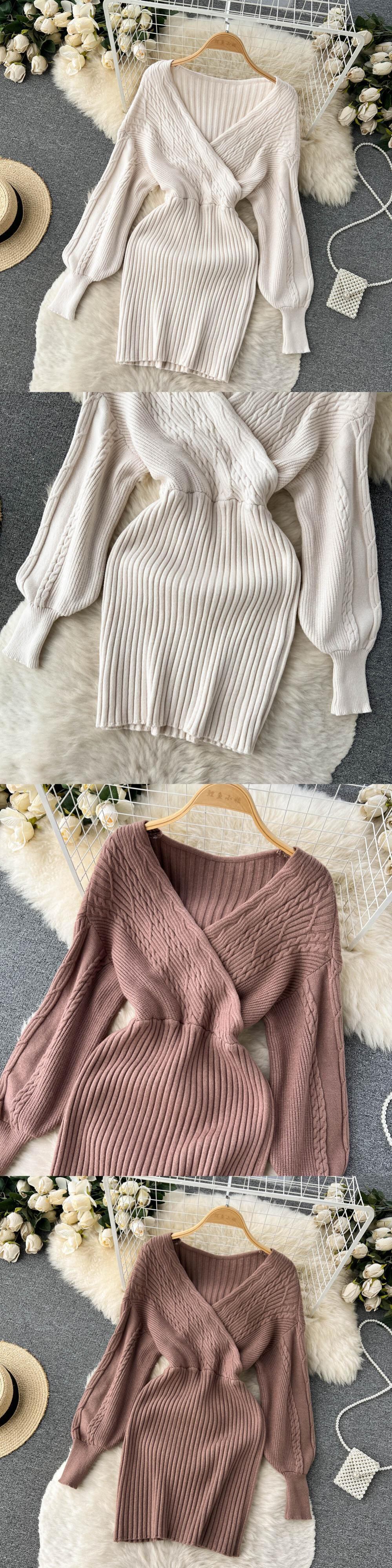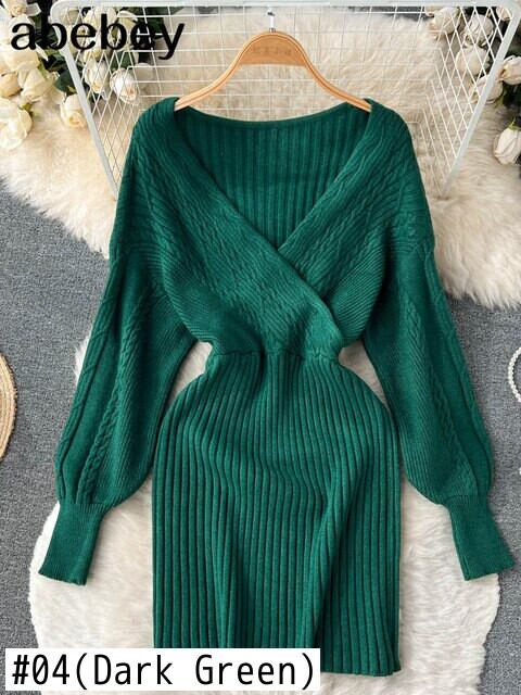 ボディコンセクシーなセータードレス女性フレンチスタイル長袖 V ネック弾性ウエストミニドレスショートニットドレス ロング エラスティック 伸縮 Vネック Abe67926609755