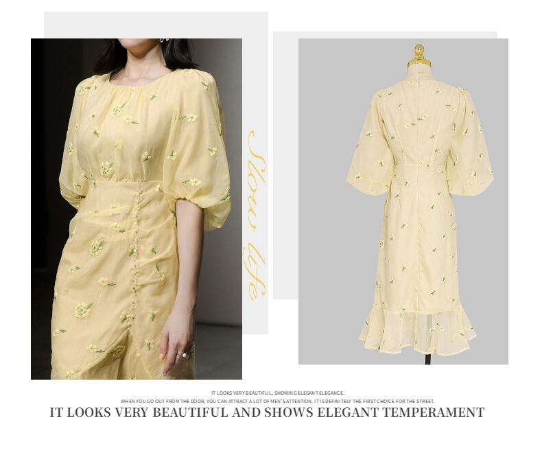 女性ミディドレス 2022 夏半袖花柄刺繍ガーゼ黄色魚の尾ドレスオフィスレディひだ人魚 desses ハーフスリーブ サマー 夏物 会社 学校 通勤や通学にも Rhc13541644204