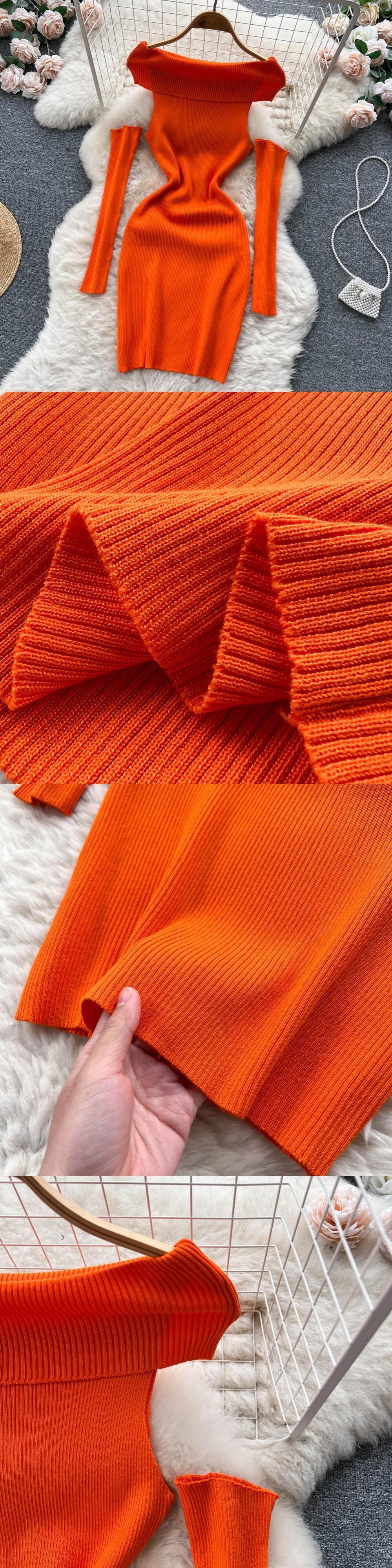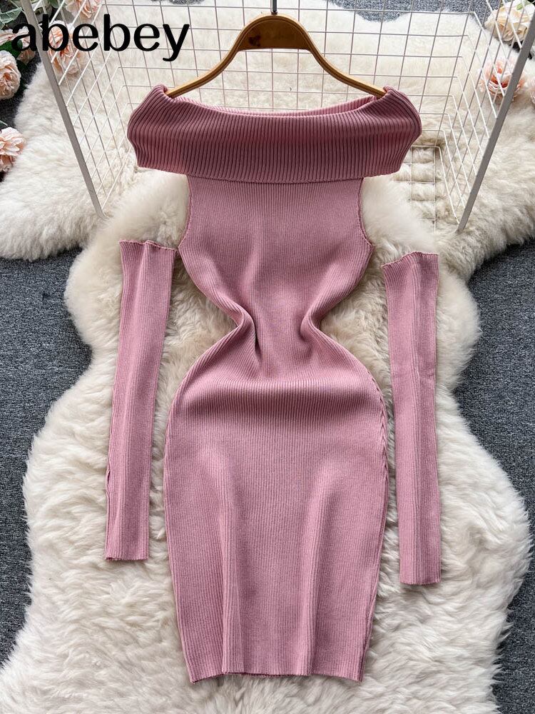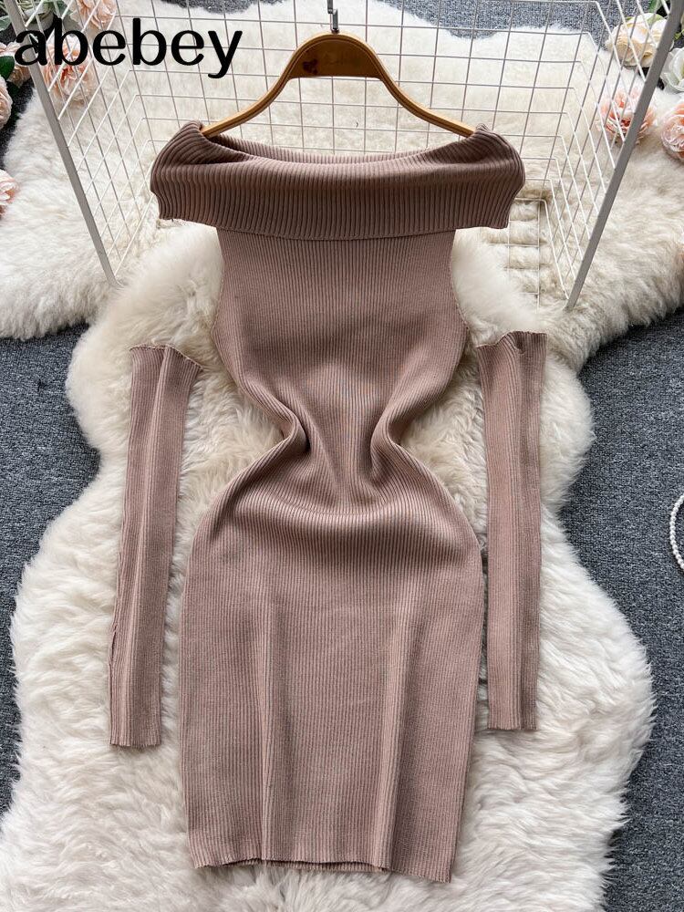 スラッシュネックセクシーなパーティーニットドレス 2022 弾性ウエスト長袖スキニー冬の女性のセーターショートミニドレス ロング エラスティック 伸縮 ウィンター 冬物 Abe71676908753