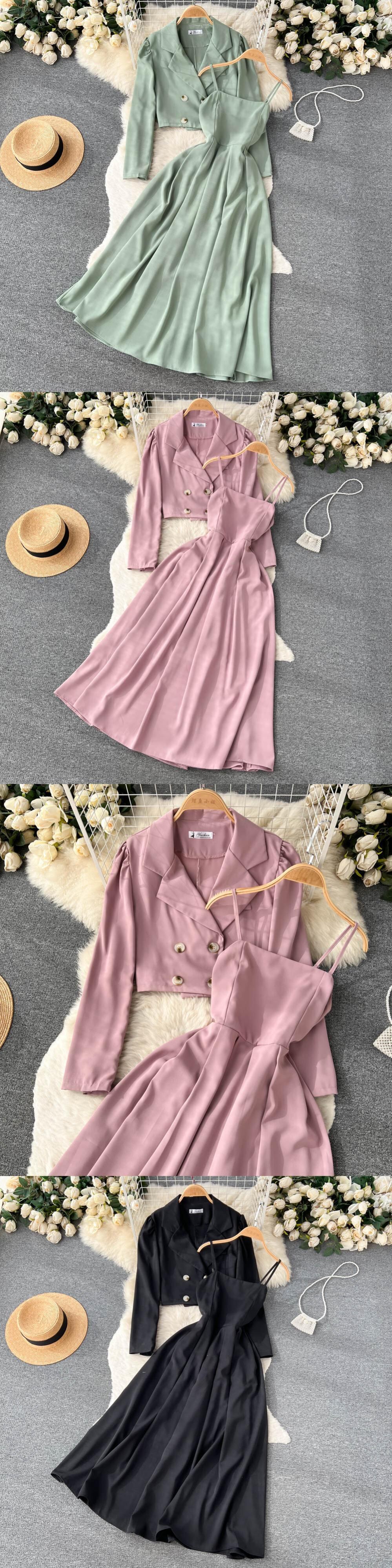 秋の赤/緑/紫のツーピースセットターンダウンカラーシングルブレストショートコート+スパゲッティストラッププリーツドレスsui オータム 秋物 グリーン パープル Abe95552018986