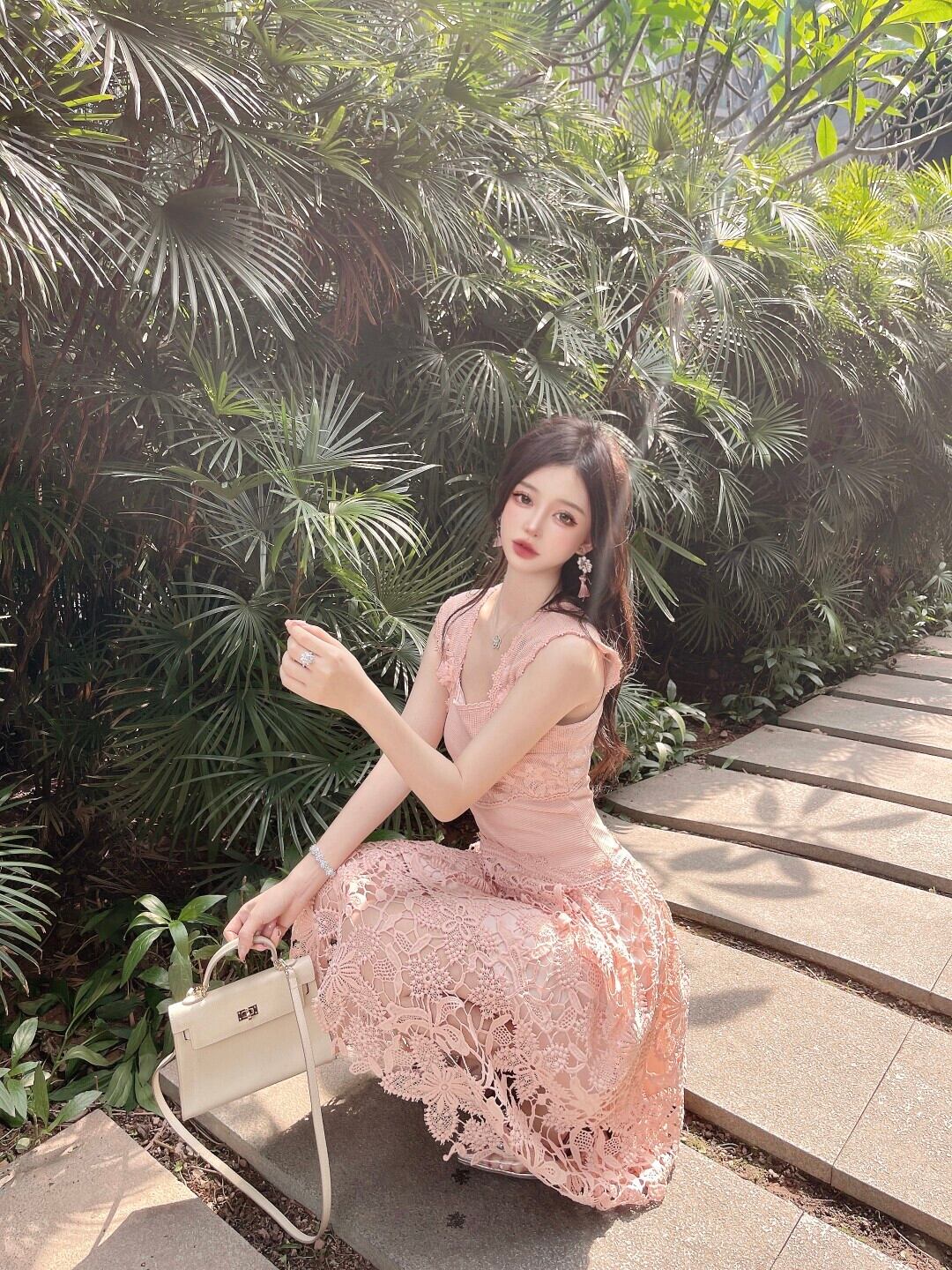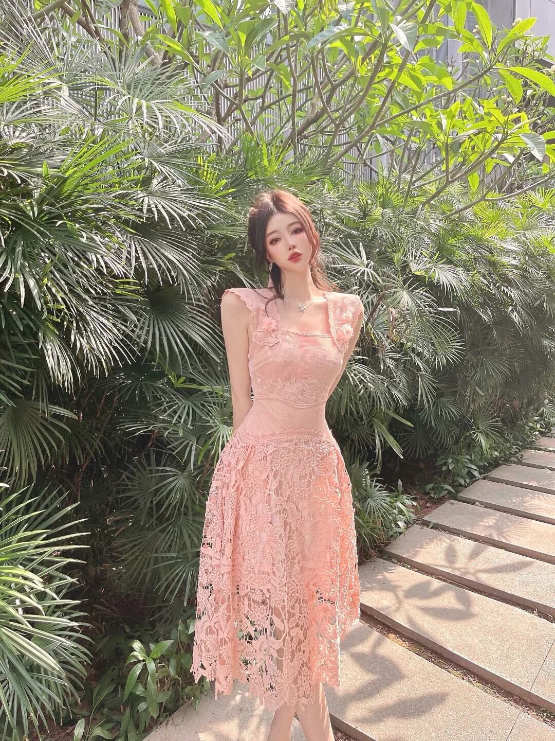 ランウェイ 刺繍 レディース ドレス スクエアネック ノースリーブ ボディコンドレス フック フラワー 中空 ストリート レディース フラワーデザイン スクウェア Rhc13319017861