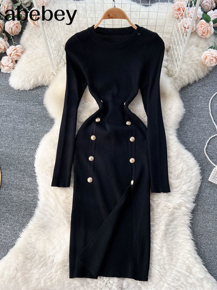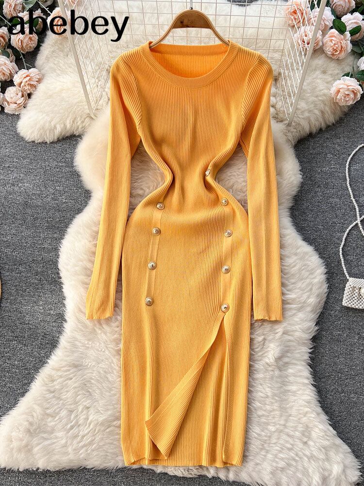 分割 bottons 秋ニットミディドレス o ネック長袖弾性ウエストセクシーなニットドレス女性スリム暖かいセータードレス ロング エラスティック 伸縮 オータム 秋物 Oネック Abe35774860659