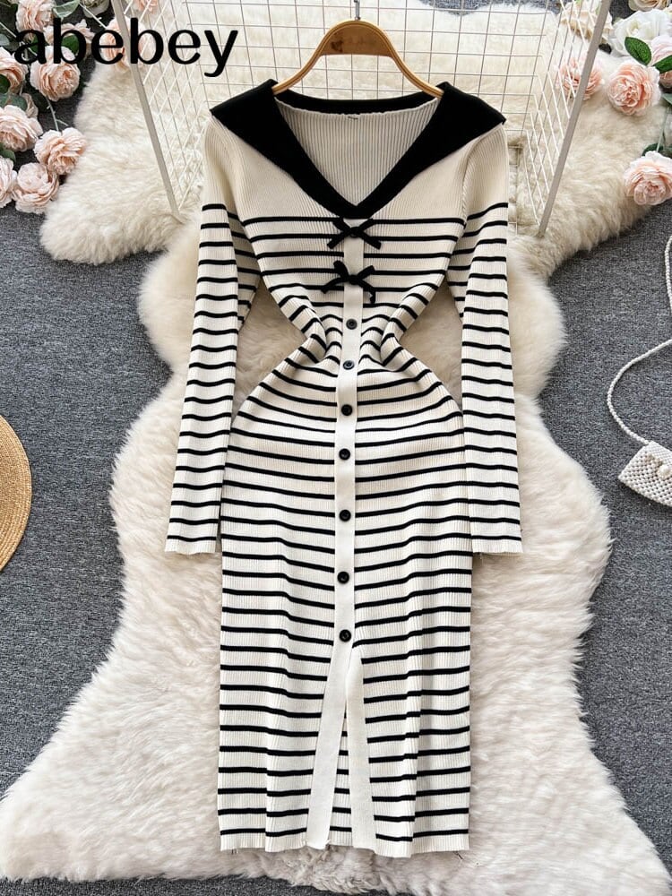 2022 女性のシックな弓ストライプニットロングドレススリットスリム V ネック長袖秋因果ドレス リボン オータム 秋物 Vネック Abe32313867483