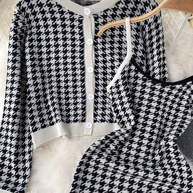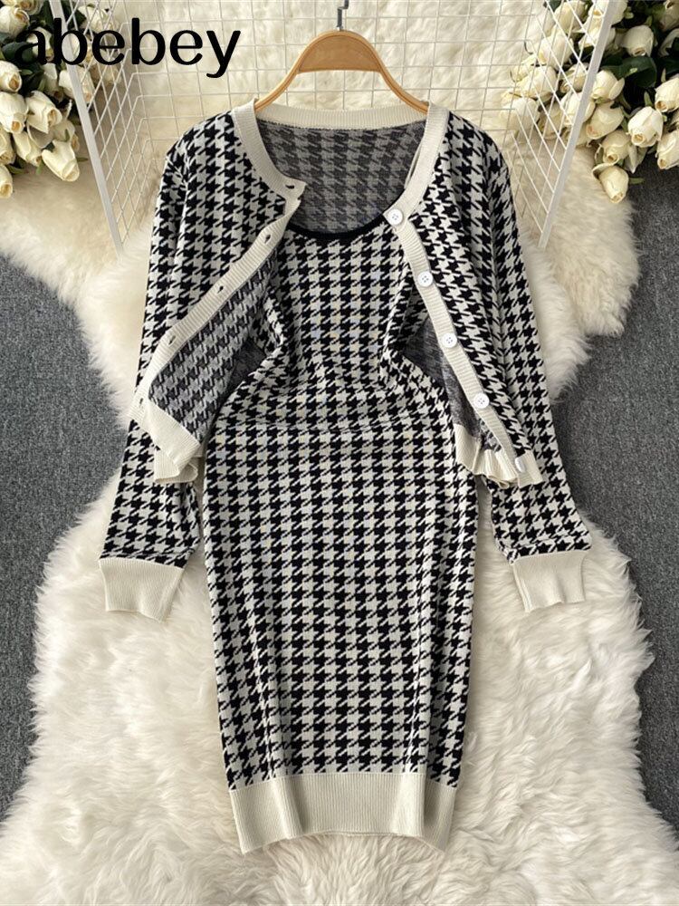 女性ニットツーピースセット格子縞プリントスパゲッティストラップボディコンミニドレスと長袖ニットカーディガンスーツ婦人服セット ロング Abe34184183766