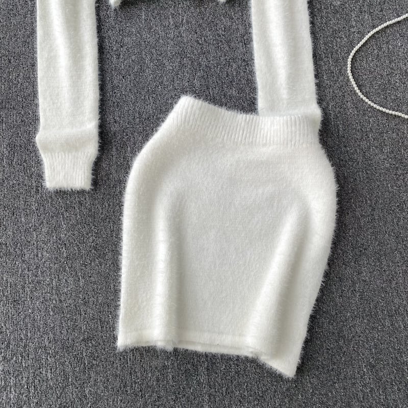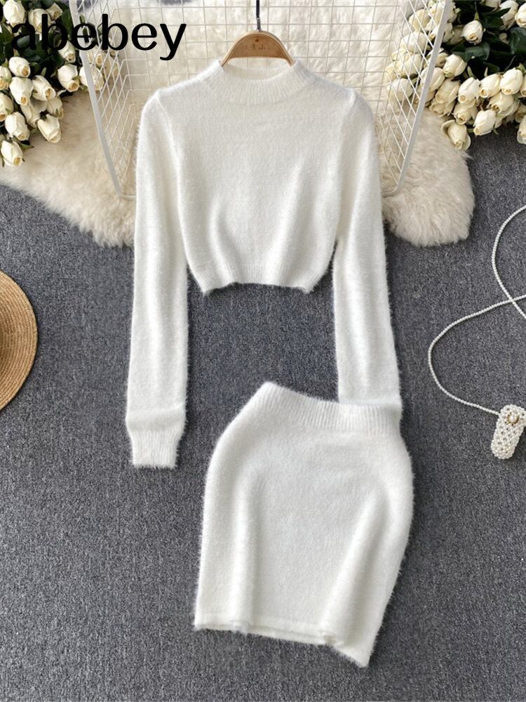 女性優しいニットツーピーススーツソフトセーターショートトップ + ウエストミディミニスカートスーツ弾性スリム冬セット衣装 エラスティック 伸縮 ウィンター 冬物 Abe74853062024