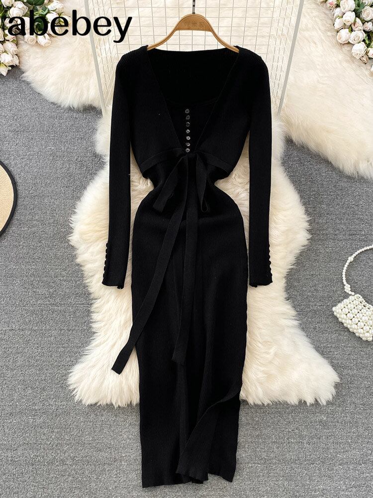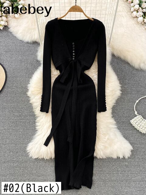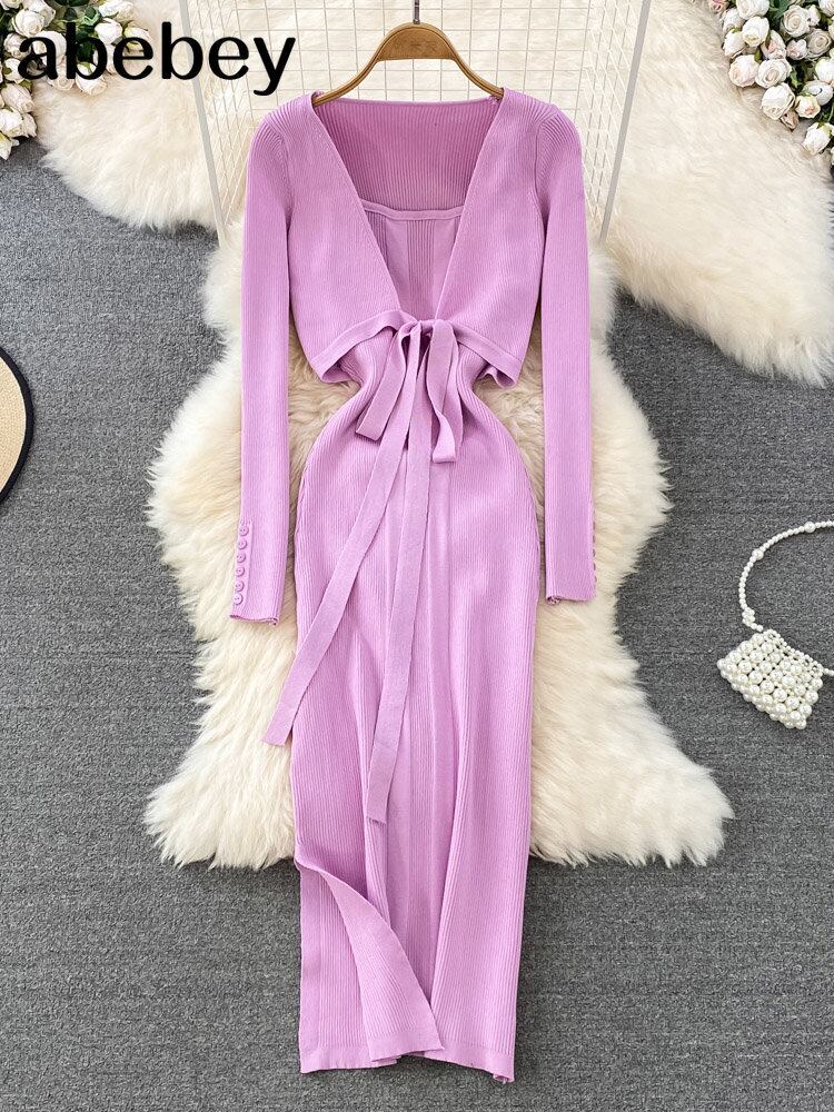 パープル 2022 ニット女性セットルーズ長袖セーターカーディガン + 固体弾性ドレスフレンチスタイルのツーピースセット ロング エラスティック 伸縮 ソリッドカラー Abe31771441182